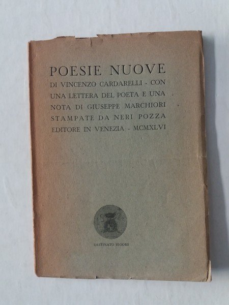 Brossura, cm. 17,4 x 12,4, pp.56. Con una lettera del poeta e una nota di Giuseppe Marchiori. Prima edizione. Firma di appartenenza e data, qualche difetto.