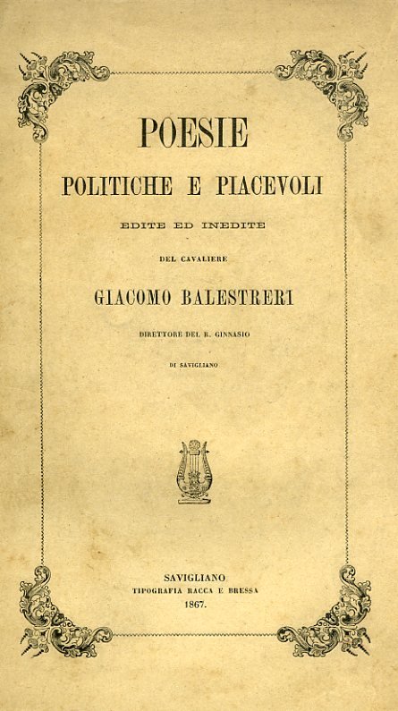 In-8°, pp. 248, brossura editoriale con titolo e figura di cetra entro bordura con fregi angolari. Diffuse fioriture interne, ma dicreto esemplare. Edizione parzialmente originale. Poesie in vario metro e di varia ispirazione: per nozze, celebrative di Casa Savoia, di esaltazione patriotica e risorgimentale, per varie occasioni, etc. Citiamo, fra i vari componimenti: In morte del Conte Cavour; Il Brigantaggio; Al Beato Amedeo di Savoia; Napoleone III e l'Italia; L'onomastico di un Parroco; Sant'Agata; Fasi dell'italiano Risorgimento; La Caccia sul Lago di Rieti, etc. L'autore era Direttore del Regio Ginnasio di Savigliano.