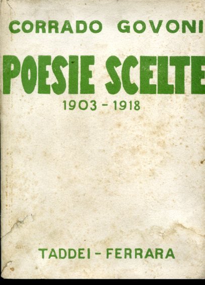 In-8°, pp. XVIII, (2), 359, (5), brossura editoriale con titolo in verde. 3 ritratti fotografici di Govoni f.t. Fioriture alla brossura. La brossura posteriore è rifatta per tre quarti. Alcuni aloni e fioriture interne. Prima edizione in raccolta, con alcune liriche inedite (sono comprese anche le liriche del periodo in cui Govoni fu un fiancheggiatore del Futurismo). L'esemplare fa parte della tiratura ordinaria non numerata, impressa in 3000 copie; ne fu fatta anche una tiratura di testa di 100 copie numerate e firmate, legate in cartone con copertina floreale illustrata a colori da Mario De Paoli Bellusi. Gambetti / Vezzosi, p. 397: 'Poesie tratte dalle precedenti raccolte, apparse su periodi e inedite'. Spaducci, p. 147. Salaris, p. 41. Cammarota, 249-16.