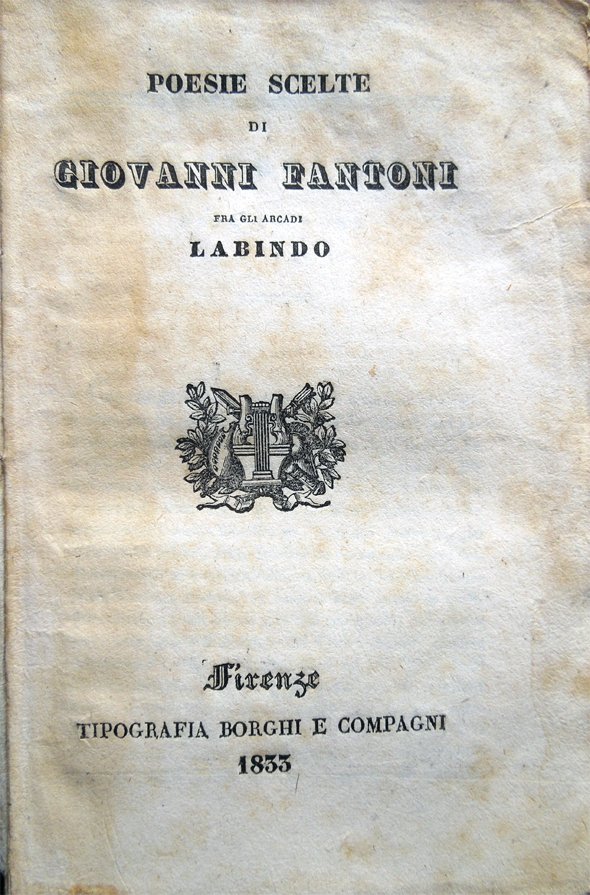 In-16° (15,5 x 10 cm), pp. (2), 263, (1), IV, copertina muta editoriale in carta azzurra con titolo manoscritto al dorso. Alcune mende alla copertina, in particolare al dorso. Qualche segno d'umido alle pagine, in particolare al frontespizio (vedi foto), per il resto in buono stato. Oltre alla prefazione dell'editore, il volume ospita un "Breve cenno sulla vita di Giovanni Fantoni fra i pastori arcadi Labindo", alle pagine dalla 11 alla 17, e alcune "Osservazioni su' metri delle odi di Labindo", alle pagine dalla 19 alla 36.