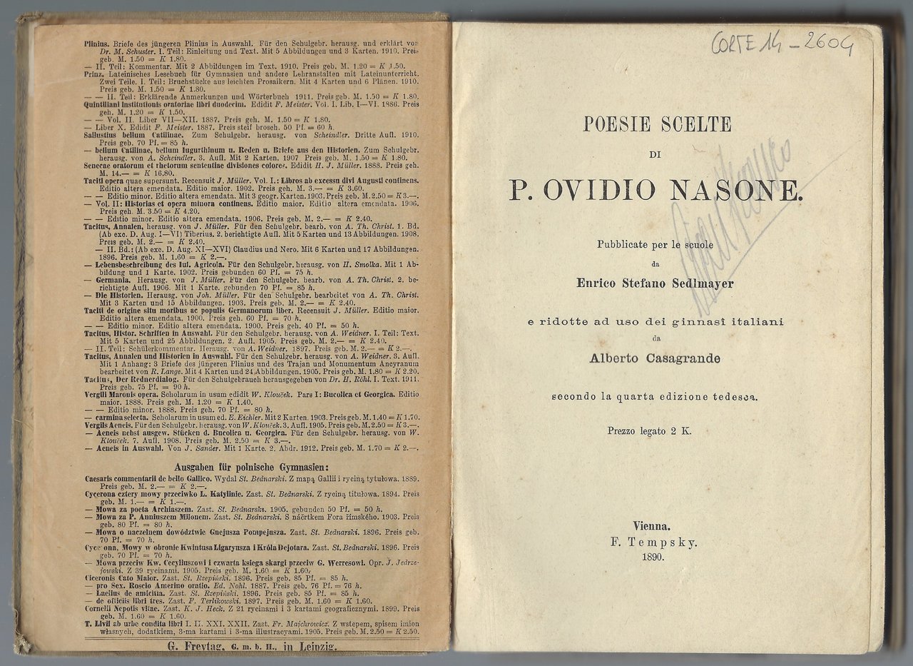 Poesie scelte di P. Ovidio Nasone, pubblicate per le scuole da Enrico Stefano Sedlmayer e ridotte ad uso dei ginnasi italiani da Alberto Casagrande secondo la 4° edizione tedesca.