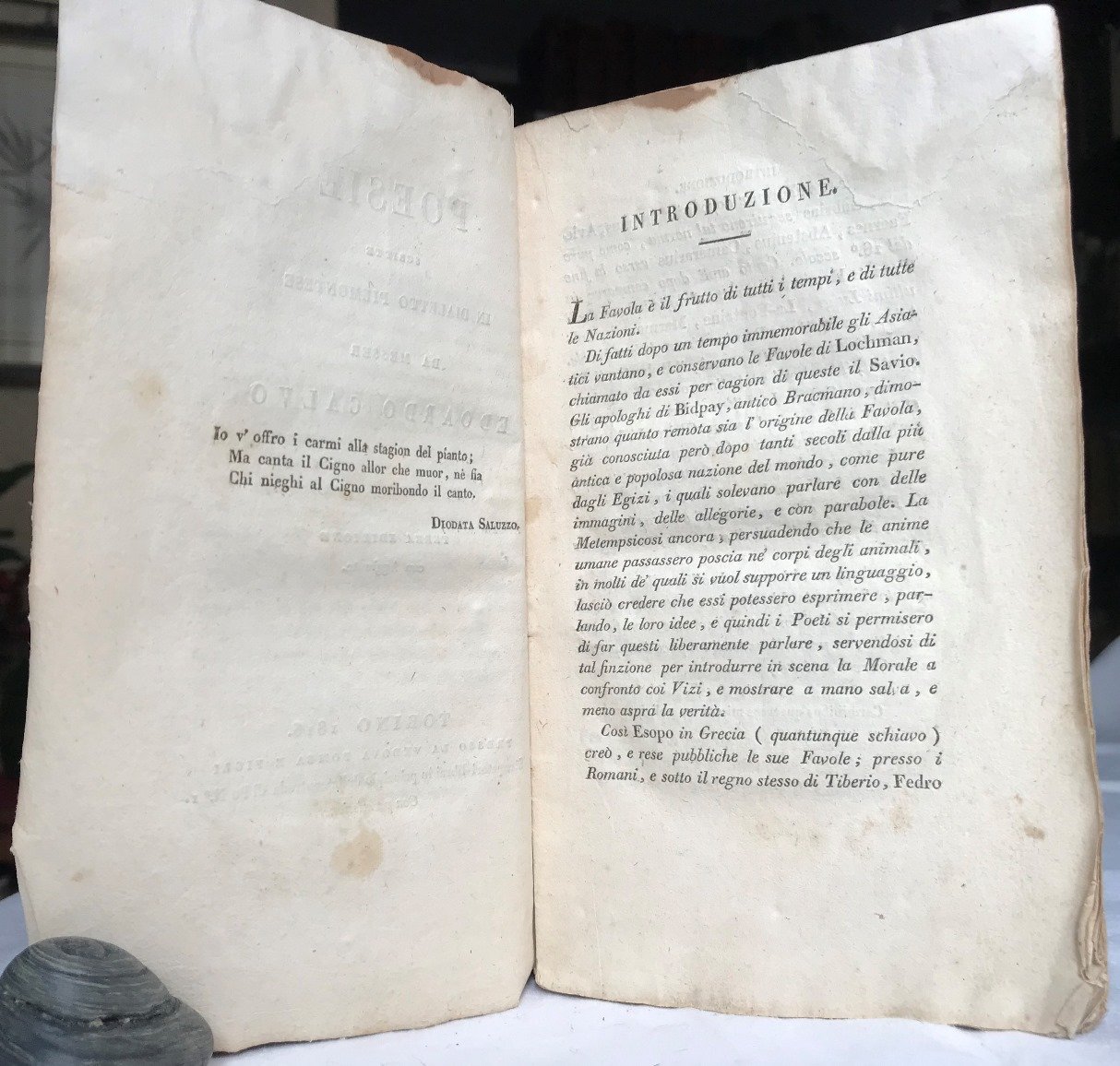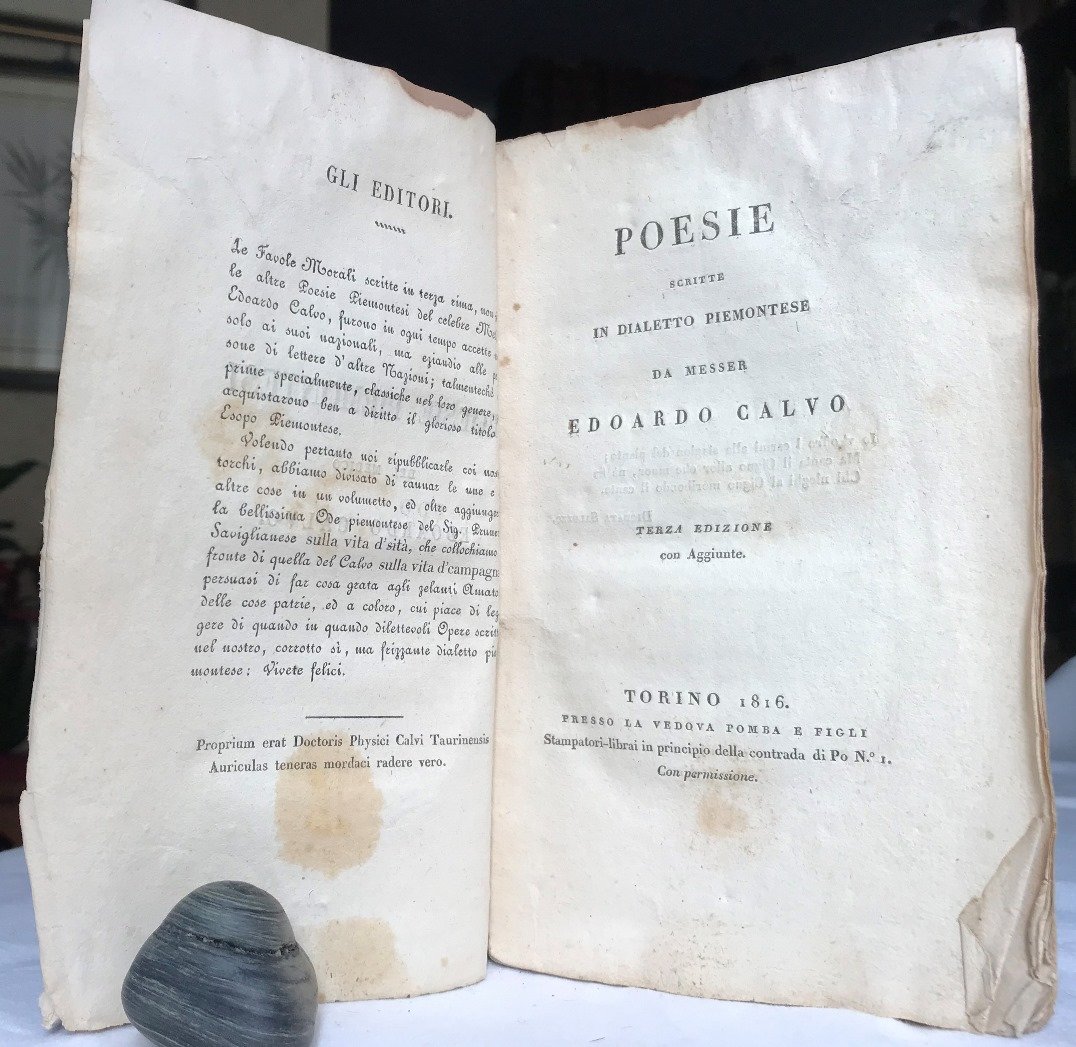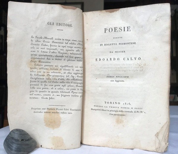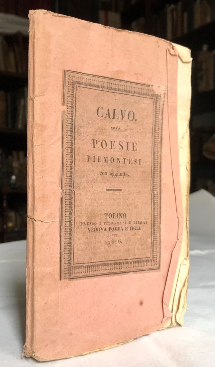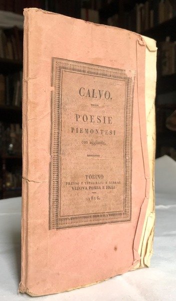 Volume in 8, brossura orginale in carta leggera, titolo entro cornice silografica al piatto, sguardie, occhiello, frontespizio, introduzione, 77 (5) pp. Questa piacevolissima edizione la prima in cui compare la bellissima Ode Piemontese del Signor Prunetti, saviglianese, sulla 'vita d'sit', che vien qui collocata a fronte di quella del Calvo sulla 'vita d'campagna' e dalla cui lettura a specchio se ne ha un vero frizzante diletto. Bella e rara edizione delle poesie del celebre medico Edoardo Calvo, soprannominato l'Esopo Piemontese. Su carta forte, in barbe, poche chiare mende d'uso, qualche orecchia. Rara ancor pi in brossura originale.