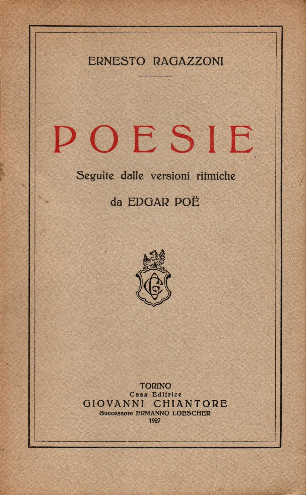 Brossura editoriale, prefazione di Arrigo Cajumi, comprende 30 poesie e 13 traduzioni da opere di Poe, ex libris a firma di Giulio Cisari al verso del frontespizio, legatura allentata.