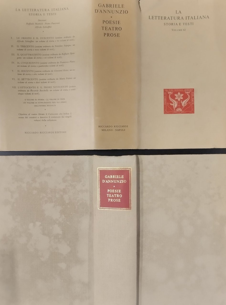 POESIE TEATRO PROSE di Gabriele D'Annunzio a cura di Maria Praz e Ferdinando Gerra. Ricciardi Editore, 1966. XLVII, 1236 pagine. Copertina editoriale in tutta tela con sovraccoperta. Stato di conservazione: molto buono (pagine normalmente ingiallite, strappi e piccole mancanze alla sovraccoperta) Libro usato saggistica