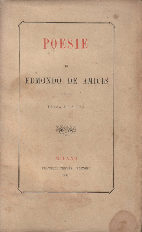 In-16° (cm 16,7x10,3), pp. (4), 275, (1), copertina editoriale con normali segni del tempo (vedi foto). Qualche leggera traccia d'umido, per il resto buon esemplare. Indice. Il figliuolo del cieco (ricordi della campagna); Bontà; La guerra; Preghiera. Ricordi di Spagna: Siviglia; Gelosia; A un'andalusa; Nei sotterranei dell'Escuriale. Ricordi d'Olanda: Paesaggio olandese; L'amore del barcarolo; Nevicata (vicino a Leida). Ricordi d'Affrica: Al Marocco; Nell'accampamento; La carovana sul monte. Ricordi di Costantinopoli: Al pittore Enrico Iunck; A una turca; Sulle carnificine della Bulgaria; All'acque dolci. In casa del curato; Sopra una culla; Grandinata; Nel torrente. Schizzi della vita letteraria: La letterata; Biografia; Il cocciuto; Una visita; L'amico del poeta; La circolazione dei libri; Dopo il teatro; A un giovanetto; Polemica (il figlio al padre); Il toscaneggiante (un piemontese a un toscano). Un ammiratore. Maldicenza letteraria: Crescit eunde; Incoraggiamento. A mia madre; Gli ultimi anni (a Giuseppe Giacosa); Il 20 settembre 1870: Il 20 settembre 1870; Sotto le mura di Roma (prima del 20 settembre). Il 15 ottobre 1877. Quadri e statue: Al pittore Paolo Michetti; Visite alla piccola morta; Il gioiello della vedova; La prima prova; Allo scultore Pietro Costa. Sulla strada ferrata. La pioggia: La pioggia; Alla pioggia. A una furia. Ricordi della campagna: Per un sentiero; Alla terra; Mezzogiorno (in villa); L'ultimo giorno. Sull'aia: Il contadino; La contadina. I due estremi: La morte del mastino (a un poeta verista); Cause ed effetti (a un poeta idealista). Fra cugini (a Michele Lessona); L'amore al tramonto; Al generale Perrone di San Martino, morto nella battaglia di Novara. Maldicenza di villaggio: Sfogo del farmacista; Sfogo della farmacista. A due critici. A tre poeti: All'autore delle "Lacrymae"; A un grande poeta; A un poeta pedante. Invito alla villa (a Enrico Panzacchi). Ricordi della guerra: Gratitudine; Eloquenza; Il bersagliere; Risurrezione. I bimbi: I bimbi; Annunzio di nascita; Sopra il quadernetto d'un bimbo; Ogni mattina. Gli emigranti; All'ospedale. Miserie: Miseria (a un amico); Sopra una casa d'ospizio; Incredibile dieta; Carità alla moda (lettere d'un proprietario); Alla corte d'assise; Il deputato Oibò; Il Creso; Per la veste lilla; A un esploratore dell'Africa; Il mendico; Davanti al palazzo; A un bellimbusto. A un amico; Ricordi d'infanzia; Alla gloria; A mia madre; Lampi tristi; A Firenze; Nel giardino; Come vorrei morire; Piovete, o baci; All'arte; Al libro.