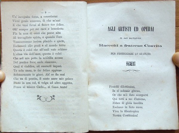 In-16° (17,5 x 12,5 cm), pp. 104, copertina editoriale. Qualche segno d'uso e del tempo alla copertina, in particolare, dorso appiattito. Leggerissimi segni d'umido alle prime 4 pagine. Errore nella rilegatura delle pagine, con la carta ospitante le pagine 83-84 anteposta a quella con le pagine 81-82, ma testo completo. Per il resto, esemplare ben conservato. Intonso. Contiene i componimenti: A B. T., versi sciolti; Agli artisti ed operai di San Salvatore raccolti a fraterno convito per festeggiare lo Statuto, ode; Nella festa d'inaugurazione della bandiera della Società degli artisti ed operai di Acqui; Nella solenne inaugurazione della bandiera della Guardia Nazionale di Balzola, terzine; Per la strage di Perugia, sestine (sui fatti del 20 giugno 1859, ndc); Per la guerra dell'indipendenza italiana il dì che pugnavasi a Montebello, ode; Nella ricorrenza del XII anniversario dello Statuto alla Società artistica-operaia di San Salvatore, sestine; Quando l'onorevole deputato P. C. Boggio rallegrava di sua presenza gli elettori di San Salvatore, ode; Il canto degli Italiani; Agli artisti ed operai di San Salvatore raccolti a solenne convito per festeggiare la 10.ma ricorrenza dello Statuto, ode; Per l'ottenuta rielezione del Cav. Farina a deputato al Parlamento, carme; In morte d'un giovine amico; Per la festa dell'unità d'Italia e dello Statuto, ode; Il magnetismo; Ad un usignuolo; Per dì onomastico; La seduzione; Per nascita d'un bambino; Per nozze; I convitati di Pio IX a Gaeta, sonetto a rime obbligate; Una favola d'Esopo, altro sonetto a rime obbligate; Per nozze, sonetto; L'egoista, sonetto; Gli affetti d'una madre, sonetto; Per dì onomastico, sonetto; Ad un mio precettore, sonetto; Per messa novella, sonetto; Per dì onomastico; Il due novembre; Una visita al cimitero, sonetto; Per nozze, sonetto; Sullo stesso argomento, sonetto; Sullo stesso argomento; Sullo stesso argomento, sonetto; Il sepolcro di Dante, epigrafe; Per dì onomastico, sonetto; Sullo stesso argomento, sonetto; Per ingresso vescovile; Francuccio e Sofia, Romanza; Agli artisti ed operai di San Salvatore raccolti a fraterno convito per festeggiare lo Statuto.