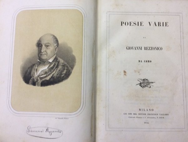 In-8 gr. (mm. 245x165), mz. pelle coeva, fregi e titolo oro al dorso, pp. 189,(3), testo in doppio filetto, con un ritratto dell'A. in litografia. "Edizione originale".Cfr. Fontana "Antologia Meneghina", p. 238: "Il comasco Giovanni Rezzonico (1789-1875) pubblicò nel 1854 un bel volume dove si leggono buoni versi italiani e milanesi. Specialmente notevoli sono le parafrasi delle favole esopiane". Solo qualche lieve fiorit. o tracce d'uso, altrimenti ben conservato.