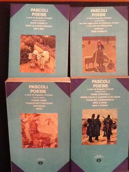 A cura di Augusto Vicinelli. Volume I° con due saggi critici di Gianfranco Contini e una nota bio-bibliografica Myricae, Primi poemetti; Volume II° Nuovi poemetti, Canti di Castelvecchio, Odi e inni; Volume III° Poemi conviviali, Poemi italici e canzoni di Re Enzio, Poemi del risorgimento, Inno a Roma, Inno a Torino; Volume IV° Poesie varie, Traduzioni e riduzioni, Appendice, Indici<br/>Collana OSCAR POESIA E TEATRO<br/>Legatura brossura<br/>Formato Sedicesimo<br/>Num Pagine 1869<br/>Prima Edizione