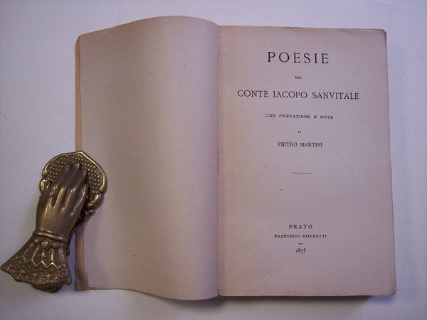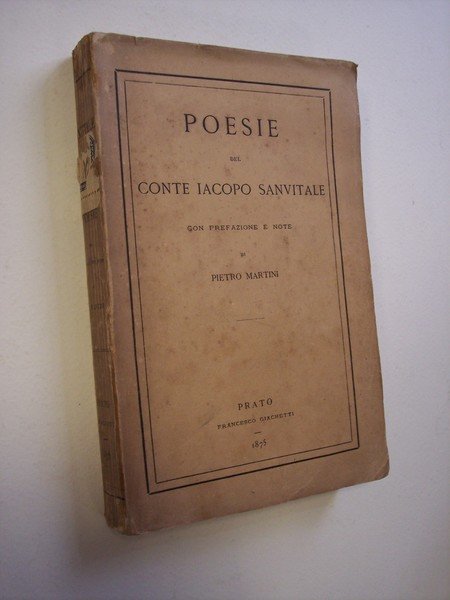 Cm. 16 x 12; pp. LVI + 372; brossura editoriale.<BR>CONDIZIONI DISCRETE: lievi tracce d'uso e piccole mende al dorso; qualche fascicolo parzialmente slegato; versi manoscritti a matita alla sguardia posteriore.<BR>Dall' indice: Notizie bibliografiche e letterarie intorno il conte Iacopo Sanvitale; poesie originali; versioni bibliche; versioni da Orazio; versioni dall'Ercole Furioso, da Schiller, da Mickiewicz, dallo spagnuolo.