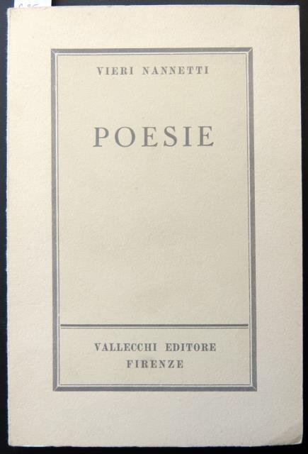 Vallecchi Editore, Firenze, 1954. In 8vo piccolo, pp. 84 (con Indice), bross. edit. in carta. Conservato l'estratto editoriale. Premio Viareggio 1954. Nacque a Firenze il 5 agosto 1895 da Ranieri e da Zaira Evangelisti. Di famiglia borghese, era pronipote del pittore Giovanni Fattori. La madre fu insegnante di lingua francese e collaboratrice di periodici letterari. Interventista convinto, allo scoppio della guerra Nannetti si arruolò volontario negli alpini, ottenendo anche due ricompense al valore e rimanendo prigioniero nel 1917. Tra i firmatari del manifesto "La scienza futurista", durante il conflitto collaborò con il periodico "L’Italia futurista" pubblicando «parole in libertà» (Piccoli posti; Quattro passi; [Ebbrezza] Nottambulo; Giardino pubblico; Fragilità) e vignette inviate dal fronte tra il 1916 e il 1917. Dopo il congedo si laureò in scienze naturali e iniziò la carriera dell’insegnamento. Superata ben presto l’adesione al futurismo, si dedicò quasi esclusivamente alla produzione letteraria, mettendo da parte l’impegno nel campo figurativo. Collaboratore di Solaria dal 1928, frequentò assiduamente insieme alla moglie Matilde Marchioni il caffè le Giubbe rosse e strinse amicizia con i principali animatori dello scenario letterario e culturale fiorentino, in particolare con Alberto Carocci, Alessandro Bonsanti, Elio Vittorini, Eugenio Montale, Arturo Loria. Proprio per le edizioni di Solaria uscirono negli anni Trenta le sue prose In concomitanza con un progressivo distacco dagli ambienti intellettuali fiorentini, sancito anche dalla chiusura di Solaria, nel 1939 Nannetti chiese e ottenne di insegnare all’estero (sappiamo che fu a Bucarest e a Budapest). Tornato in Italia, proseguì l’attività didattica a Firenze presso il liceo Michelangiolo e nel contempo concentrò in massima parte i suoi interessi letterari nella produzione di versi, i cui primissimi frutti risalivano del resto già al 1912-15. Nel 1954 pubblicò a Firenze le Poesie (con cui ottenne il premio Viareggio). Con questa silloge, suddivisa in cinque sezioni (oltre alla già edita Declamazione, Soste del malumore, 1948-50; Dimostrazione dell’autunno, 1952; Polifemo, maggio-giugno 1953; Varie, 1953), Nannetti proseguì lungo il solco già segnato da Declamazione, riprendendo e modulando il tema della profonda inquietudine e dei conflitti interiori lasciando talvolta affiorare sullo sfondo la possibilità della soluzione del tormento esistenziale. Negli ultimi anni di vita, sospinto da una sempre più urgente interrogazione religiosa e metafisica del reale, lavorò all’ultima e più ambiziosa opera poetica, l’Apocalisse in barocco, edita a Firenze nel 1957 poco dopo la sua morte. Approdo e culmine del percorso poetico e umano di Nannetti, l’"Apocalisse in barocco", con prevalenza di endecasillabi, si colloca in una prospettiva ormai palesemente sovrannaturale ed escatologica, in virtù della quale lo sguardo sulla morte e sulla fine del mondo si coniuga con la certezza della superiore riconciliazione nella trascendenza divina. Morì a Firenze l’11 giugno 1957. (Cfr. Enciclopedia on line Treccani). Allo stato di nuovo.