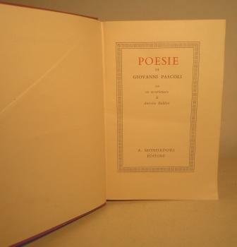 Mondadori, 3^ ed. 1943; tela ed. con titolo e fregio in oro al dorso, in 8°, pp. 1427. Stampato su carta tipo India. Con un fac - simile autografo di poesie (con le riproduzioni dei mansocritti delle favole: la favola del disarmo del 1898 e la voce del 1903) ripiegato in una tasca al piatto posteriore. Contiene: Miryce, Primi poemetti, Odi e inni, Poemi italici e canzoni di re Enzio, Poemi del risorgimento, Poemi conviviali, Nuovi poemetti, Canti di Castelvecchio, Poesie varie, Traduzioni e riduzioni. Manca la sovraccoperta. Ben conservato.