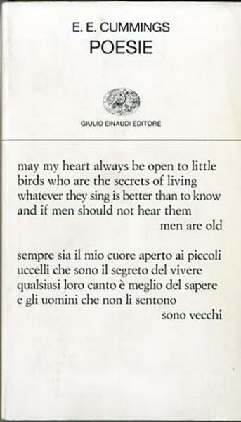 XXVII, 274 p. ; 18 x 11 cm. Collezione di poesia, 269. Nel panorama letterario americano del secolo, Cummings è un anarchico stimolato da continue folgorazioni: le sue innovazioni grafiche, le ricerche sintattiche, le esplosioni lessicali contribuiscono alla costruzione di una lirica che coinvolge pensieri e percezioni, lo sguardo e l'ascolto, in un fitto intreccio di immagini e di associazioni. Questa edizione ripropone l'antologia uscita per la prima volta (insieme alle lettere) da Einaudi nel 1974, tradotta dalla figlia di Pound, Mary de Rachewiltz. Nuova è l'introduzione di Franco Buffoni. Brossura editoriale, coperta in cartoncino flessibile plastificato opaco, titolo impresso in nero al piatto e al dorso. Sottolineature a penna rossa alle pagine V-VII, per il resto libro pulito e integro. Codice libreria 6827.