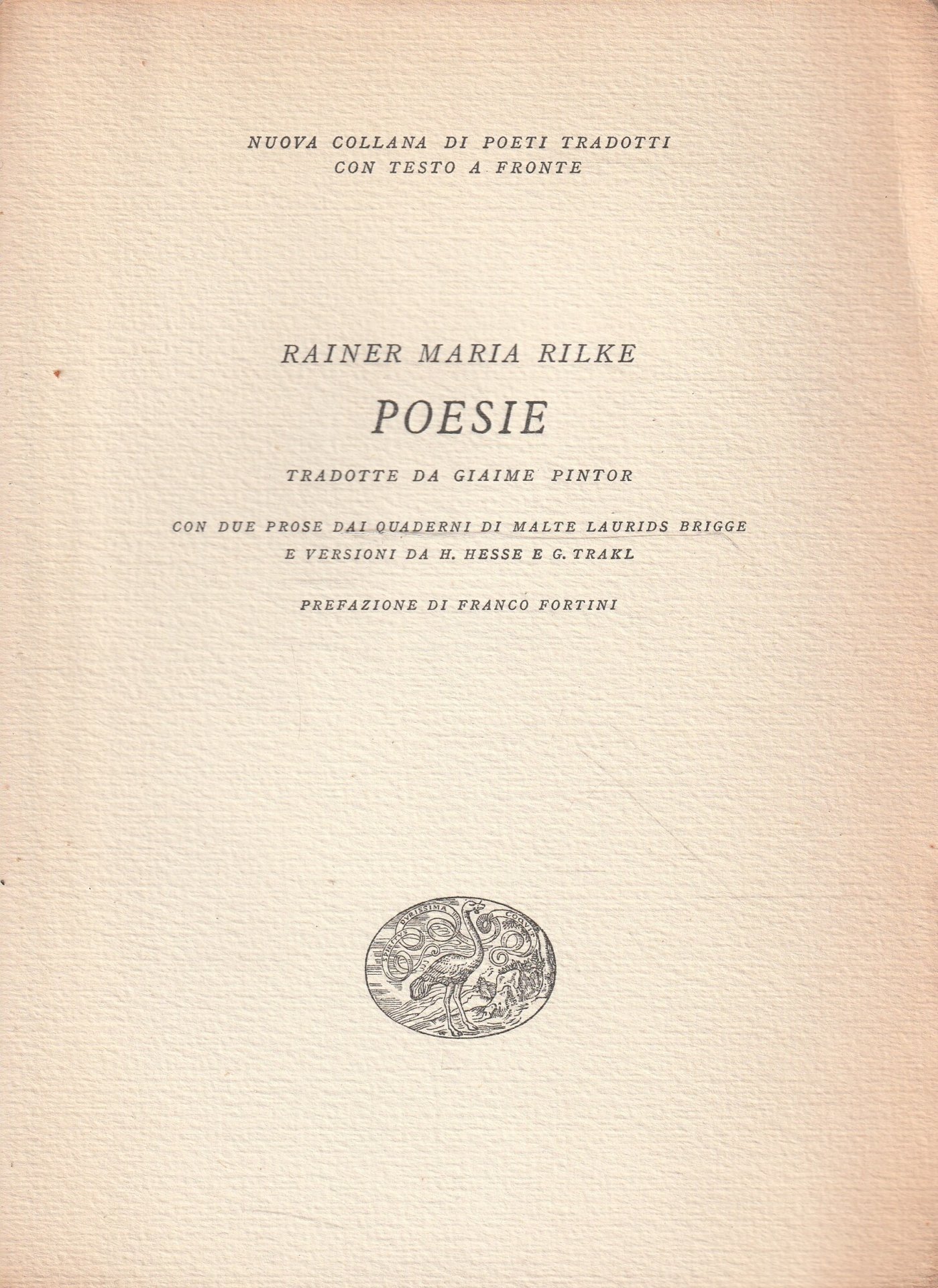 ST1181IBrossura editorialecon esto a fronte, traduzione di Giaime Pintor, con due prose dai quaderni di Malte Laurids Brigge e versioni da H. Hesse e G. Trakle, prefaz. di Franco Fortini, volume in buone condizioni, segni di usura sulla copertina, interno in ottimo stato, legatura salda, margini delle pagine ancora saldati150 pagine circacopertina come da foto