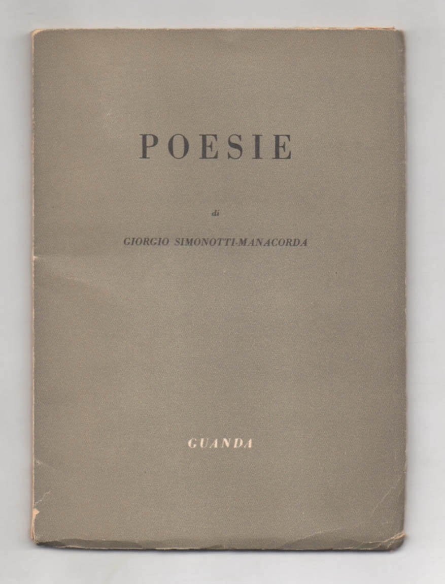 LIBROEdizione originale.Esemplare n. 73 di una tiratura non specificata: la copia del critico letterario Sergio Pautasso, fu editor Rizzoli, come da firma e data autografe. Lieve e normale brunitura, leggera traccia di gora d’umido al sottile dorsetto muto, per il resto in più che buone condizioni e a fogli chiusi.Rara opera prima del poeta di Casale Monferrato, frutto del matrimonio tra il noto imprenditore Oreste Simonotti (fu presidente dell’Inter 1929-1931, allora Ambrosiana) e la nobile Vittoria Manacorda. Dopo questo esordio, negli anni ’60 pubblicò con le più vivaci piccole sigle editoriali dell’epoca, fino ad approdare sulla «bianca» di Einaudi nel 1967 (I banchi di Terranova).