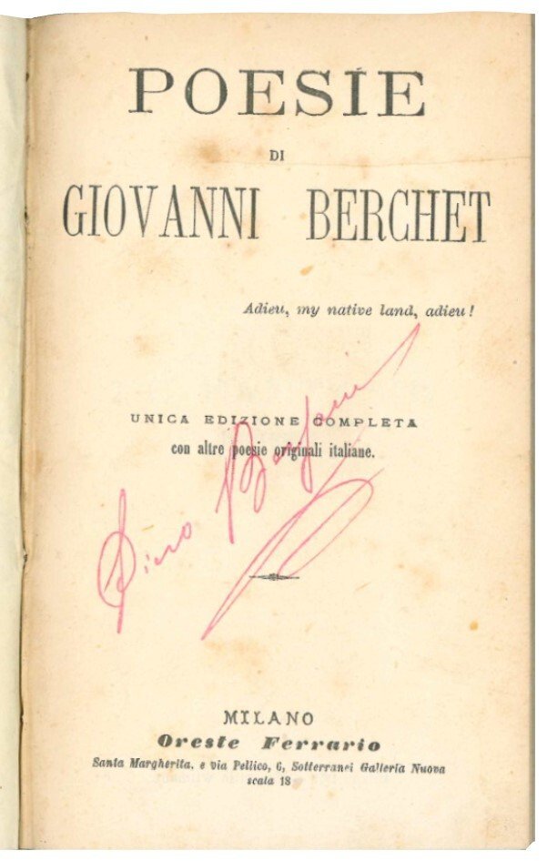 Mm. 150x90. Pp. 143, [3]. Carta lievemente ed uniformemente brunita, presenza di lievi fioriture alle prime carte. Esemplare con firma di possesso al frontespizio. Mezza pelle con titolo inciso in oro al dorso. Unica edizione completa con altre poesie originali italiane.