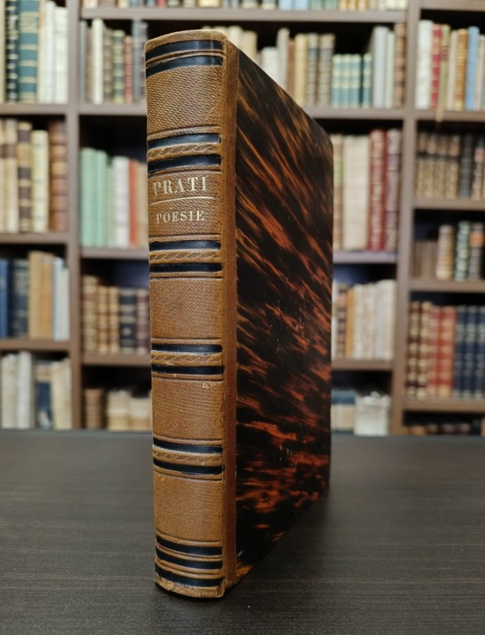 5 volumi in 1 in-8° (cm. 20,1), legatura coeva in mezza pelle nocciola, dorso con titolo in oro, filetti in nero e a secco e fregi sempre a secco ai nervi (lievissime tracce d'uso), tagli spruzzati in blu; carte in stato molto buono (lievi e sporadiche fioriture). Lira silografica ai frontespizi, testatine e finalini sempre in silografia. Non comune raccolta delle poesie del Prati. Esemplare molto buono. (NH7)