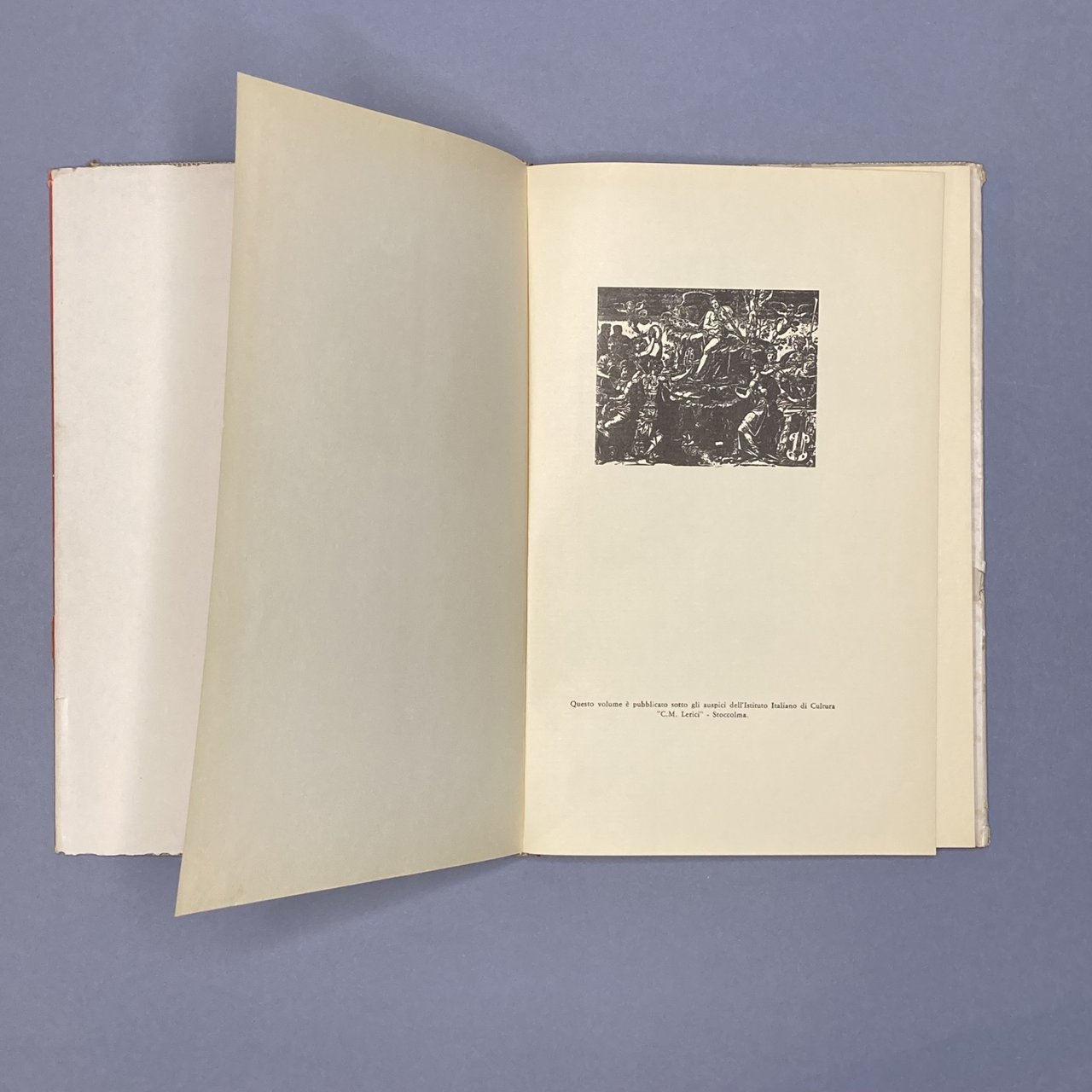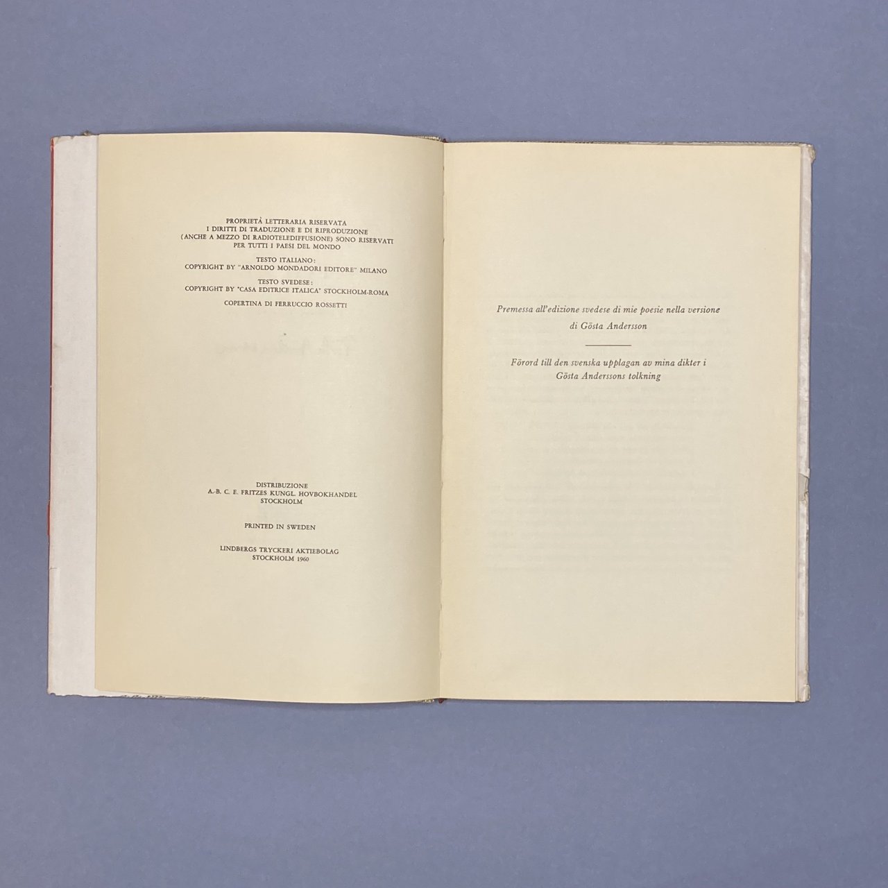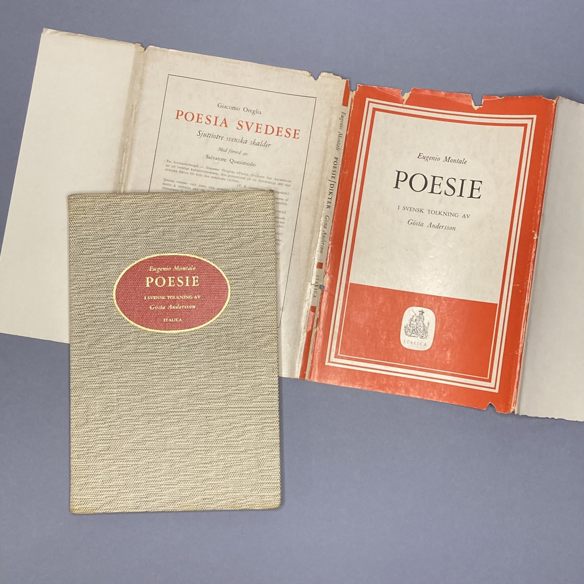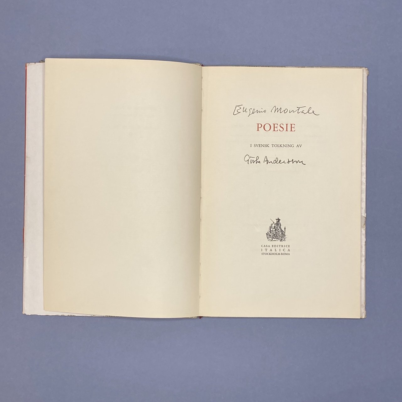 8°, cm 22, pp. 87, (7), rilegatura in tela con titolo in oro entro cartiglio rosso al centro del piatto; sovracoperta bianca e rossa con alette e titoli entro cornice al piatto. Contiene 16 poesie di Ossi di Seppia tradotte in svedese da Gosta Anderson, con premessa inedita. Biblioteca di Cultura – Collana Poesia Italiana, n. 2. Edizione originale in versione rilegata, sfuggita al Gambetti che registra solo la prima edizione in brossura. Piccole mancanze alla sovracoperta del tutto marginali, peraltro ottima copia.. *** TUTTI I NOSTRI LIBRI SONO VISIBILI PREVIO CONTATTO MAIL O TELEFONO NELLA NUOVA SEDE DI MILANO: LIBRERIA COSMOPOLIS, VIA JOMMELLI, 22. ***