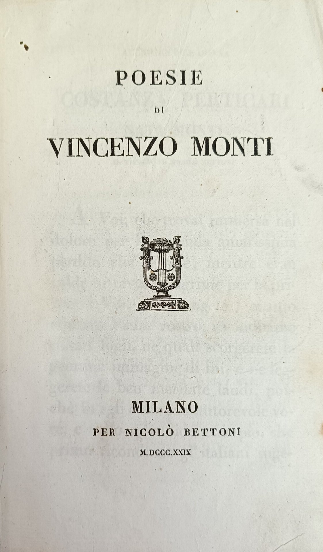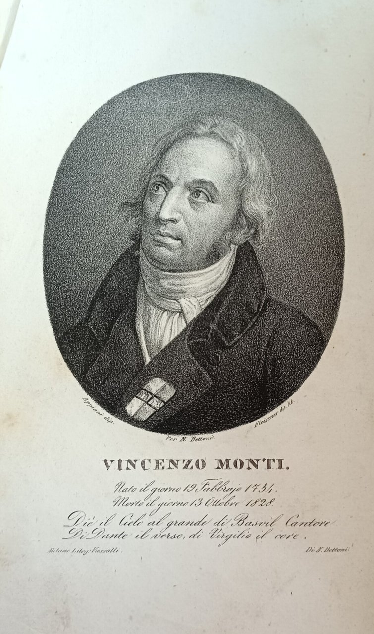 incisione all'antiporta di Vincenzo Monti. in quarto leg. mezza pelle, titolo in oro a tassello al dorso pp. (4), 336 Buono (Good) Buon es., lievi difetti alla rilegatura.