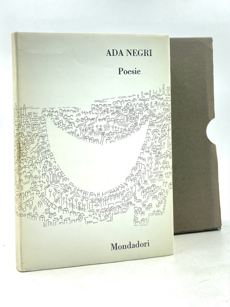 Tela con sovraccoperta e custodia muta in cartoncino nero, cm 20 x 13.5, pp XVI 1014 (2), ritratto dell’autrice all’antiporta protetto da velina, taglio superiore azzurro. Buono stato, dedica a penna su una carta di guardia, angolo del prezzo ritagliato dal risvolto della sovraccoperta. Opere in versi della poetessa lodigiana, primo dei due volumi delle Opere di Ada Negri curate da Bianca Scalfi e Egidio Bianchetti per la collana diretta da Giansiro Ferrata, I Classici Italiani Contemporanei. Terza edizione. Contiene le sillogi Fatalità (1892), Tempeste (1893), Maternità (1904), Dal profondo (1910), Esilio (1914), Il libro di Mara (1919), I canti dell’isola (1925), Vespertina (1929), Il dono (1935), Fons Amoris (1939-1943), oltre ad un appendice (Echi di guerra, Luci e ombre), una prefazione di Arnoldo Mondadori, e un foglio ripiegato in tasca a fine volume con facsimile di autografo delle poesie Sprofondar dentro te (in tre stesure) e Il grano insanguinato.