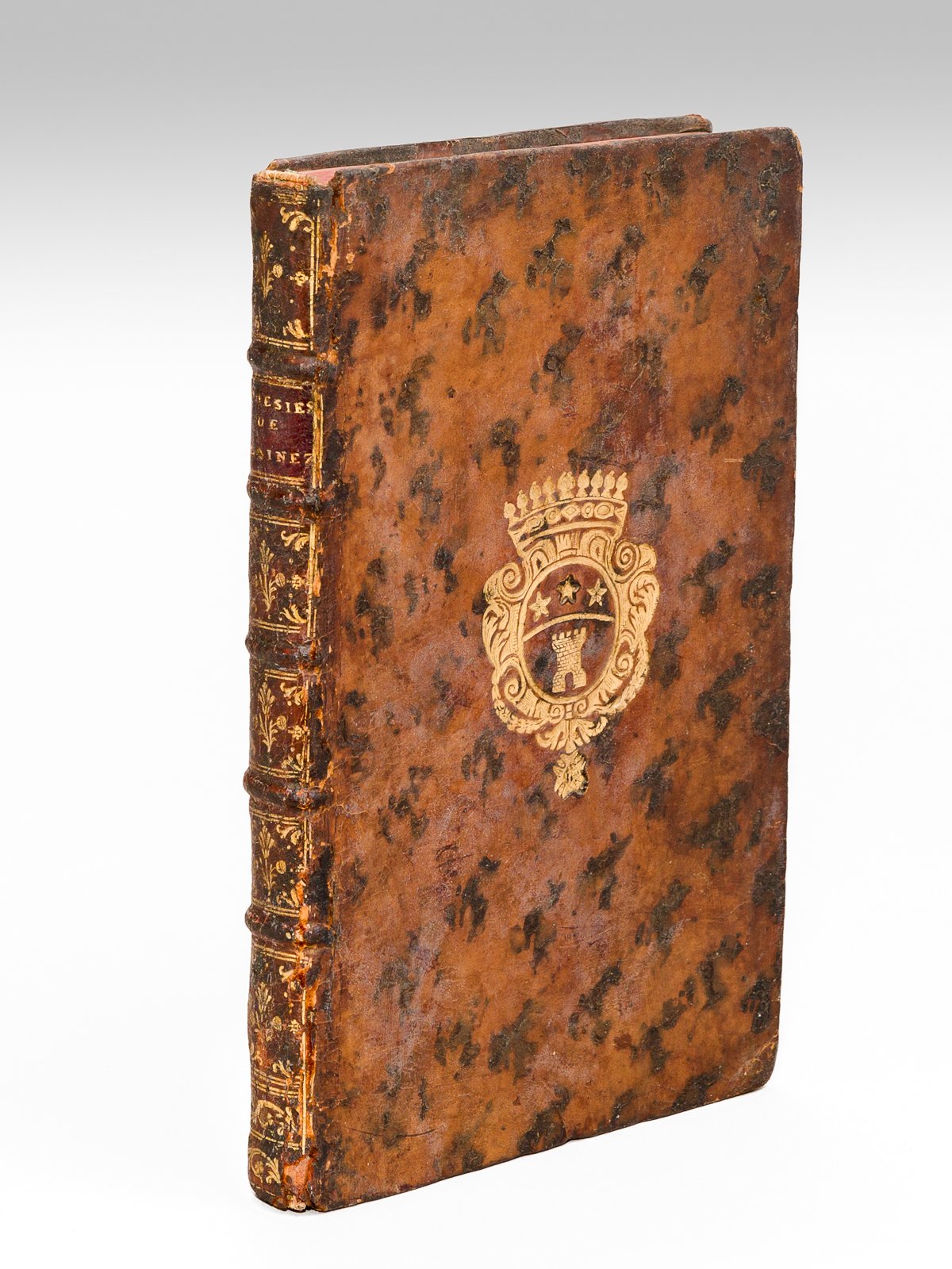 1 vol. in-8 reliure de l'époque pleine basane marbrée, dos à 5 nerfs orné, armes dorées poussées en plats (tour au chef chargé de trois étoiles), Aux Dépens de la Compagnie, A La Haye, 1753, XXII pp., 1 f., 112 pp. Reliure armoriée, possiblement aux armes des familles de Boullongne si l'on en croit Olivier, Hermal et Roton (OHR, 2360, avec un encadrement de blason différent) ou de Mas-Latrie. Alexandre Lainez (vers 1653-1710) né à Chimai (Belgique), ville du Hainaut autrichien, le poète appartient à la famille du célèbre jésuite. Après des études à Reims, il vit un temps à Paris avant d'entreprendre de longs voyages en Orient ("il était fort estimé de M. de l'Isle, celèbre Géographe"). "Lainez étoit grand Poëte, grand Humaniste, grand Géographe, & s'ils se peut, encore plus grand buveur" ! "Outre le François, il savoit parfaitement le Grec, le Latin, l'Italien & l'Espagnol, & possédoit les meilleurs Auteurs qui ayent écrit en ces différentes langues". On doit ce recueil renfermant des poésies anacréontiques, des chansons, des bouquets, des portraits, ou des épigrammes à M. Titon du Tillet. Les poésies de Lainez chantent souvent les vertus du vin de Champagne et sa passion pour la gastronomie et les plaisirs éclate dans les titres de ses piéces : "Prière à Bacchus", "Invocation au Sommeil", "Bains de la Porte Saint-Bernard", La Salade épicurienne", "La Marmelade", "Les Pressoirs de Champagne", "La non jouissance voluptueuse", etc. Bon état (reliure un peu frottée avec très petits mq. de cuir au second plat et en dos, coiffe sup. arasée) pour cette reliure armoriée. Cf Paquot, Mémoires pour servir à l'histoire littéraire des dix-sept provinces des Pays-Bas, II, 244 s.