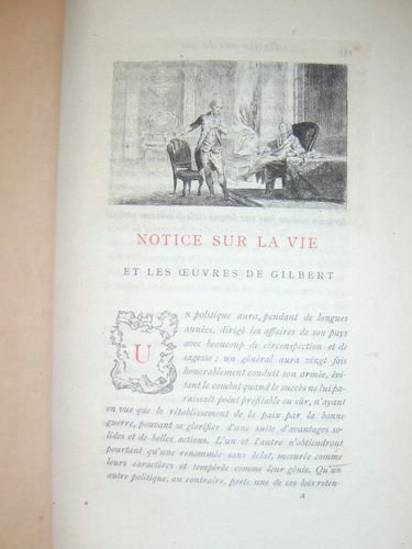 Avec une notice bio-bibliographique par Paul Perret, un des 50 exemplaires sur Chine numérotés, portrait de L. Gilbert et une vignette, gravée par Gaujean, hors-texte, avec un fac-similé d'autographe, 1 vol. in-8 br., couv. rempliée, coll. Petits Poètes du XVIIIe siècle, A. Quantin, Paris, 1882, 2 ff., XXXVI-221 pp. , 1 f. n. ch. Un des 50 exemplaires sur Chine numéroté, avec 2 suite des des gravures. Bon état (qq. rouss.). Vicaire, VI, 747