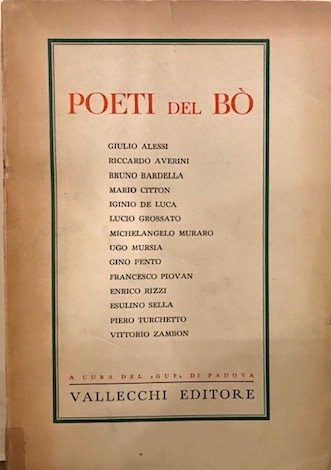 8vo (cm. 19,8), 198 pp. Brossura editoriale (piccola riparazione al piede del ds.). La raccolta contiene poesie di: Giulio Alessi, Riccardo Averini, Bruno Bardella, Mario Citton, Iginio De Luca, Lucio Grossato, Michelangelo Muraro, Ugo Mursia, Gino Pento, Francesco Piovan, Enrico Rizzi, Esulino Sella, Piero Turchetto e Vittorio Zambon. Buon esemplare a fogli chiusi. Prima edizione.