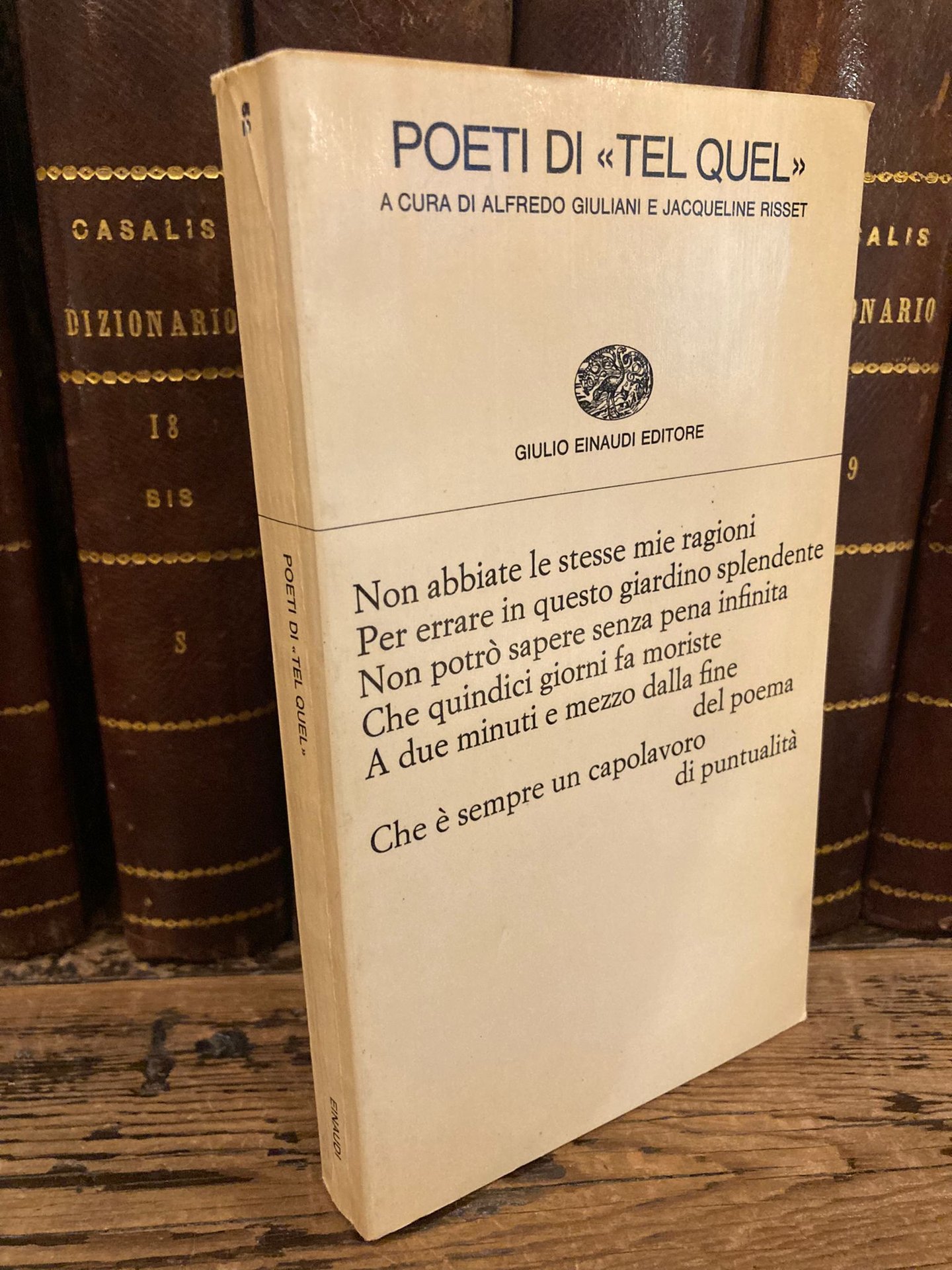 In-16° (18x10 cm), pp. 250 (6), brossura editoriale con titoli in nero e lirica al piatto anteriore, paratesti al posteriore. Collezione di poesia, 52. Più che buon esemplare. Edizione originale di quest antologia rappresentante la 'poetica del segno' elaborata dagli scrittori esponenti della rivista poetica d' avanguardia 'Tel Quel' che dal 1960 indaga i problemi della letteratura e scienze umane.