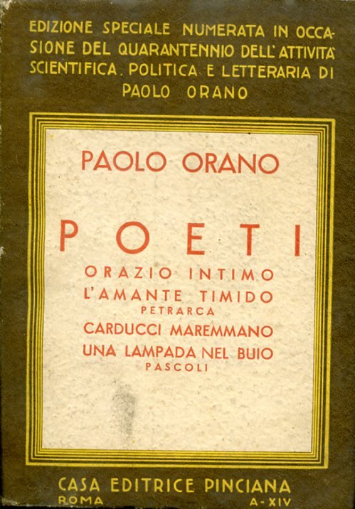 Poeti. Orazio intimo. L'amante timido: Petrarca. Carducci maremmano. Una lampada nel buio: Pascoli. Edizione speciale numerata in occasione del quarantennio dell'attività scientifica, politica e letteraria di Paolo Orano