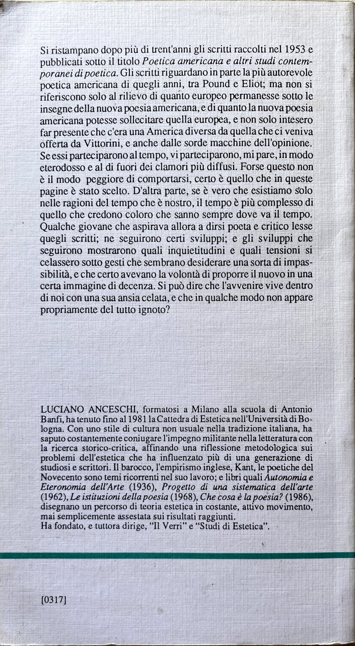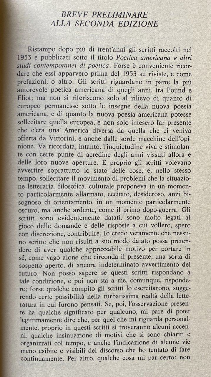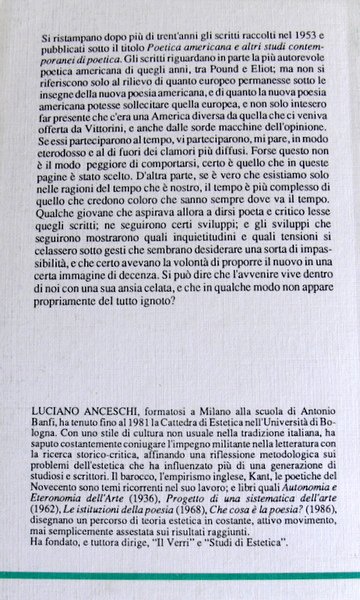 Si ristampano dopo più di trent'anni gli scritti raccolti nel 1953 e pubblicati sotto il titolo Poetica americana e altri studi contemporanei di poetica. Gli scritti riguardano in parte la più autorevole poetica americana di quegli anni, tra Pound e Eliot; ma non si riferiscono solo al rilievo di quanto europeo permanesse sotto le insegne della nuova poesia americana, e di quanto la nuova poesia americana potesse sollecitare quella europea, e non solo intesero far presente che c'era una America diversa da quella che ci veniva offerta da Vittorini, e anche dalle sorde macchine dell'opinione. Se essi parteciparono al tempo, vi parteciparono, mi pare, in modo eterodosso e al di fuori dei clamori più diffusi. Forse questo non è il modo peggiore di comportarsi, certo è quello che in queste pagine è stato scelto. D'altra parte, se è vero che esistiamo solo nelle ragioni del tempo che è nostro, il tempo è più complesso di quello che credono coloro che sanno sempre dove va il tempo. Qualche giovane che aspirava allora a dirsi poeta e critico lesse quegli scritti; ne seguirono certi sviluppi; e gli sviluppi che seguirono mostrarono quali inquietudini e quali tensioni si celassero sotto gesti che sembrano desiderare una sorta di impassibilità, e che certo avevano la volontà di proporre il nuovo in una certa immagine di decenza. Si può dire che l'avvenire vive dentro di noi con una sua ansia celata, e che in qualche modo non appare propriamente del tutto ignoto?