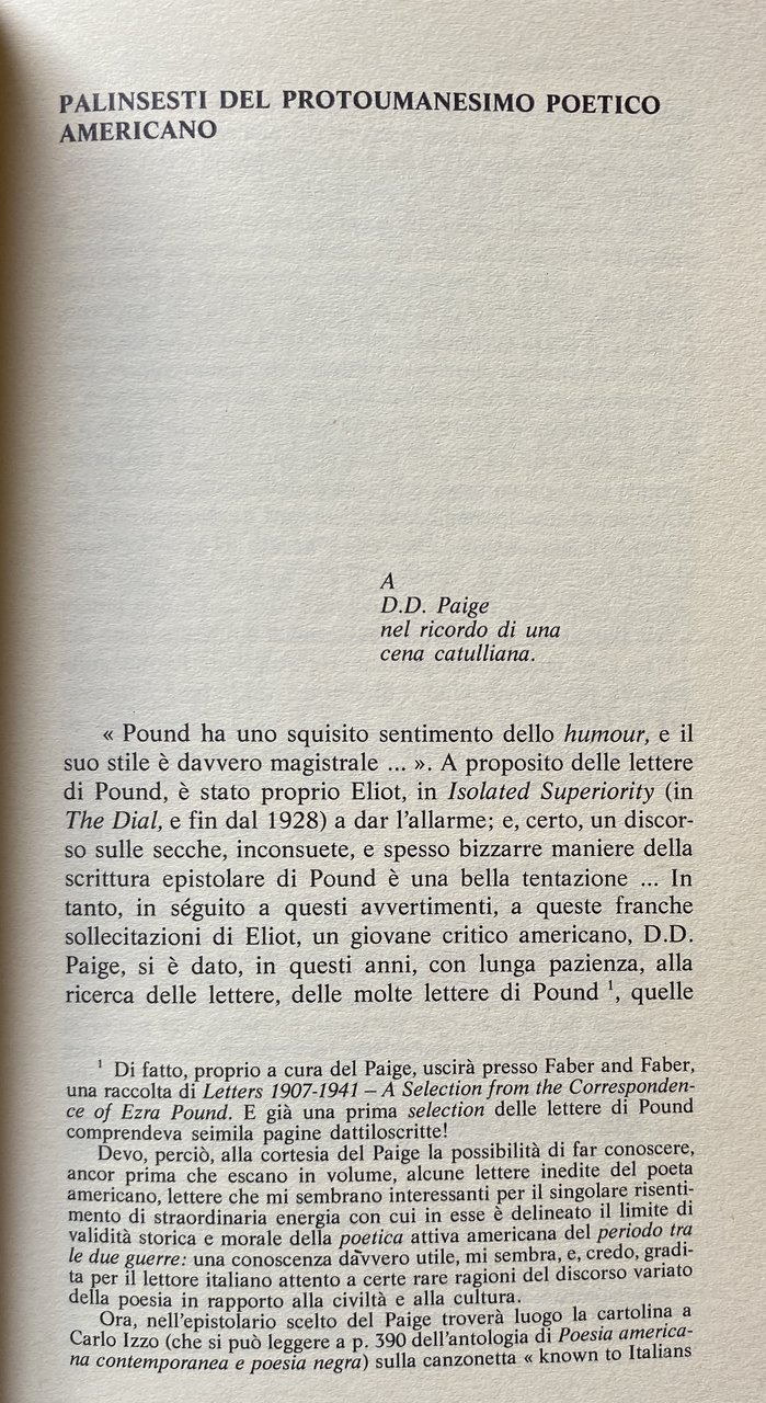 Soggetti: Critica Letteraria, Saggi, Studi Critici, Ezra Pound, Protoumanesimo, Enzo Paci, Estetica, Metodologia, Franz Kafka, Letteratura Americana contemporanea, Studi culturali, Poesia, Novecento, Ottocento, Stati Uniti, Scrittori americani, Viaggio, Beat Generation, Libri Vintage fuori catalogo, Saggi, Filosofia, Poetica, Simbolismo, Scrittori americani, Racconti, Narrativa, Cultura, Ottocento, Novecento, Negritudine, Negri, Neri americani, Antologie, Raccolte, Jean Paulhan, Nouvelle Revue Française, André Gide, Alain, Paul Valéry, Francia, Les Lettres françaises, Jacques Decour, Anarchismo, Anarchici, Thomas Stearns T. S. Eliot, Modernismo, Alienazione, Società, James Joyce, Virginia Woolf, Imagismo, Oggetto, Pascoli, Gozzano, Sbarbaro, Montale, Espressionismo, Cubismo, Surrealismo, Dadaismo, Astrattismo, Futurismo, Esistenzialismo, Relativismo, Psicoanalisi, Metalinguaggio, Viaggio, Militanza politica, Attivismo, Lettere, Corrispondenza, Epistolario, Biografie, Metodologia, Fernanda Pivano, Traduzione, Husserl, Pragmatismo americano, Dewey, Interpretazione, Parola, Oggetto, Linea Lombarda, Sperimentazione dei Novissimi, Poetiche americane, Gruppo 63, Ideologia, Neoavanguardia, Neorealismo, Ermetismo, Antagonismo, Marxismo, Waste Lande, Parallelismi, Confronti, Letterature comparate, Intuizionismo, Risentimento, Bergson, Proust, Ferdinand Lion, Mass und Wert, Riviste, Thomas Mann, Giacomo Debenedetti, del Praz, Pamela Johnson, Venturi, Longhi, Critici, Intelletuali, Della Volpe, Borgese, Crocianesimo, Benedetto Croce, Stilistica, Due Generazioni, Critica Militante, Gerontion, Portrait of a Lady, Rhapsody on a Wind, Recensioni, Recensori, Arti performative, Mirskij, Correlativo oggettivo, La terra desolata, Tradition and the Individual Talent, Romanzo, Detective fiction, Mystery tale, American Crime, S.S. Van Dine, Edgar Allan Poe, Rimbaud, Verlaine, Laforgue, Iris Barry, Lyrical Ballads, Oggettivismo, Harriet Monroe, Ritmo, Sintassi, Ezuversity, Alan Porter, The Spectator, Wallace Stevens, Hilda Doolittle, T. S. Eliot, William Carlos Williams, Carl Sandburg, Landor, Stile, Byron, Tacito, The Sacred Wood, Rémy de Gourmont, Milton, Yeats, Flaubert, Chartreuse, Stendhal, Voltaire, Orazio, Catullo, Properzio, Ovidio, Virgilio, Swinburne, Villon, Dante Alighieri, Guido Cavalcanti, Horace, Walter Pater, Latina, Greca, Teocrito, Carlo Izzo, Mackail, Wharton, Saffo, Odissea, D.D. Paige, The Isolated Superiority, Libri rari, Collezionismo, Bibliografia, Consultazione, Riferimento, Citazioni, Literary criticism, Essays, Critical studies, Proto-humanism, Aesthetics, Methodology, Contemporary American literature, Cultural studies, Poetry, Twentieth century, Nineteenth century, United States, Writers, Travel, Books out of print, Essays, Philosophy, Poetics, Symbolism, Writers Americans, Tales, Fiction, Culture, Nineteenth Twentieth Century, Negritude, Negroes, Blacks, Anthologies, Collections, France, Anarchism, Anarchists, Modernism, Alienation, Society, Subject, Expressionism, Cubism, Surrealism, Dadaism, Abstractionism, Futurism, Existentialism, Relativism, Psychoanalysis, Metalanguage, Travel, Political Militancy, Activism, Letters, Correspondence, Epistolary, Biographies, Methodology, Translation, American Pragmatism, Interpretation, Word, Object, Experimentation of the Latest, American Poetics, Group, Ideology, Neo-avant-garde, Neorealism, Hermeticism, Antagonism, Parallels, Comparisons, Comparative Literature, Intuitionism, Resentment, Magazines, Critics, Intellectuals, Stylistics, Two Generations, Militant Criticism, Reviewers, Performing Arts, Mirsky, Objective Correlative, The Waste Land, Novel, Objectivism, Rhythm, Syntax, Tacitus, Horace, Catullus, Propertius, Ovid, Virgil, Latin, Greek, Theocritus, Sappho, Odyssey, Rare Books, Collecting, Bibliography, Reference, Quotes