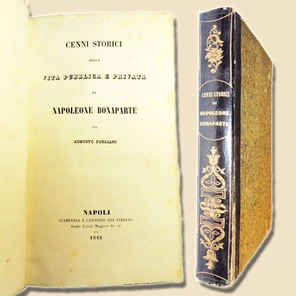 Augusto Pogliani, Cenni storici della vita pubblica e privata di Napoleone Bonaparte, Stamperia e Cartiere del Fibreno, Napoli 1842, pp. 393, cm 21, elegante legatura coeva in mezza pelle con titoli e bei fregi in oro al dorso. Timbro d’appartenenza a secco all’occhiello. Lievissime tracce d’uso alla legatura, per il resto esemplare perfetto con legatura ancora ben solida. Opera rarissima impreziosita da legatura di pregio.