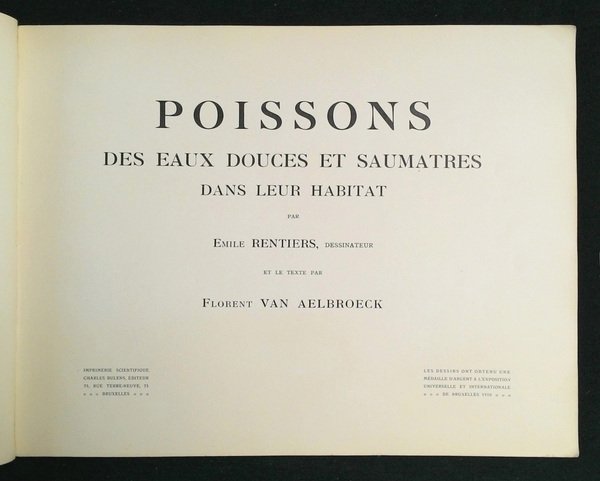 in-4° oblungo (245x320 mm); leg. in brossura editoriale beige, con titolo a caratteri rossi e neri al piatto; cm 24,5 x 32; pp. 116; 22 tav. a cura di Emile Rentiers; frontespizio a caratteri neri. Prima edizione di questa rara opera sui pesci d'acqua dolce e salmastra. -- 22 planches illustrées par Emile Rentiers, rouss. sur la couverture. -- FIRST EDITION OF A RARE ILLUSTRATED WORK ON FRESHWATER AND BRACKISH WATER FISH. Presence of brownings; copy in good condition. -- Rif.: Non censito su ICCU e su OCLC. Cond.: Presenza di bruniture; opera in buone condizioni generali.