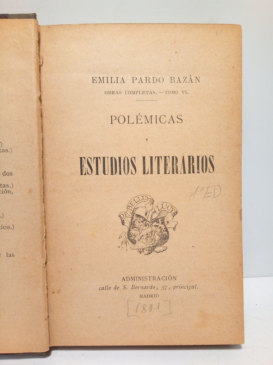 [PRIMERA EDICION].- Madrid: Administración (Imp. Agustín Avrial), [ca.1891].- 304 p.; 8º (17,7 x 11,7 cm); Enc. en Tela Cartoné.- (Obras Completas. 6).- MUY RARO.* Papel ligeramente tostado. Las tapas levemente restauradas de mínimas rozaduras en las esquinas. LITERATURA Y FILOSOFÍA ESPAÑOLAS DE LOS SIGLOS XIX-XXI Y SU HISTORIA EN GENERAL