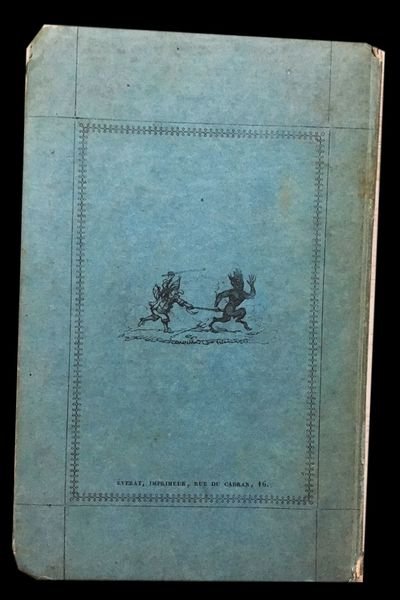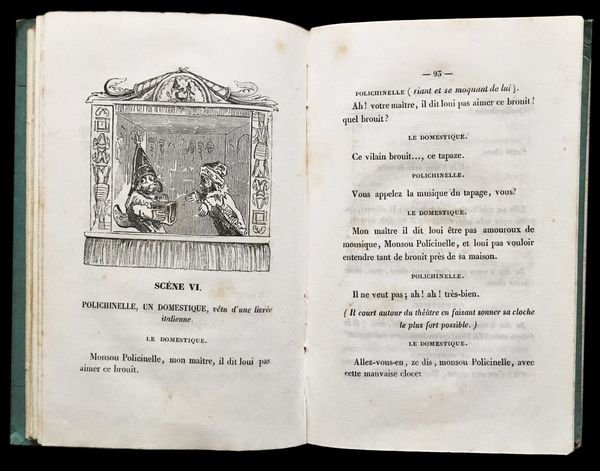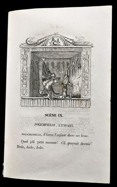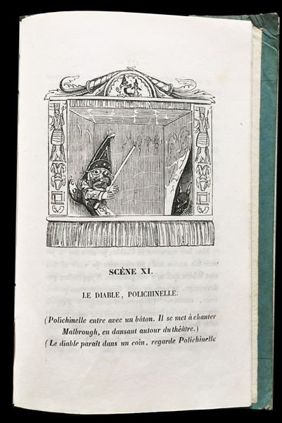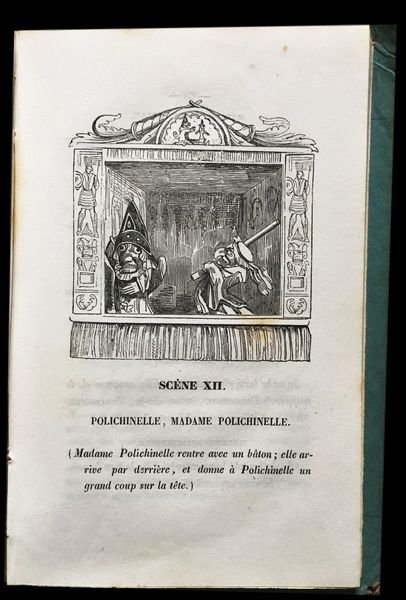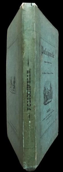 In 8° (16,5x10,5 cm); 157, (5) pp. Legatura editoriale in cartoncino rigido azzurro con titolo con vignetta satirica impresso in nero, entro cornice xilografica al piatto anteriore. Titolo impresso in nero al dorso. Al piatto posteriore bella vignetta, entro cornice, con Pulcinella che insegue un demonio. Piccoli difetti agli angoli del piatto anteriore, qualche lieve fioritura in poche pagine dovuta alla qualità della carta, ma meno estesi di quelli presenti solitamente negli altri esemplari conosciuti e nel complesso esemplare in buone condizioni di conservazione. Ritratto di Pulcinella in antiporta e vignetta al frontespizio. Numerose curiose illustrazioni nel testo, prese dal teatro dei burattini, realizzate dal celebre illustratore inglese, George Cruikshank (Londra, 27 settembre 1792 Londra, 1º febbraio 1878) che veniva definito il moderno Hogarth dai suoi contemporanei e che divenne enormemente celebre per le illustrazioni che accompagnavano le opere di Charles Dickens e per le sue satiriche illustrazioni della monarchia inglese nonostante la sua anima fortemente patriottica. Per Charles Dickens, Cruikshank illustrò la raccolte Sketches by Boz (1836), The Mudfog Papers (1837-38) e il romanzo Le avventure di Oliver Twist (1838). Cruikshank recitò persino nell'amatoriale compagnia teatrale di Dickens. Gli autori che si nascondono sotto lo pseudonimo di Olivier et Tanneguy de Penhöet non sono stati mai identificati con certezza. Secondo Quérard potrebbero essere Olivier Mainguet e Anatole Chabouillet, futuro curatore del Gabinetto delle medaglie. Lintroduzione dellopera è una vibrante difesa della figura storica di Polchinelle, nome corrispondente del Pulcinella napoletano, quando utilizzato nella commedia dellarte francese, troppo spesso, utilizzato per produzioni di pessimo gusto e di basso livello. Si hanno così 31 pagine che ripercorrono la figura e la storia della maschera pulcinella. Prima edizione non comune, completa della sua legatura originale. Non cité par Cohn.- Gumuchian, Les Livres de l?Enfance, n° 4403.