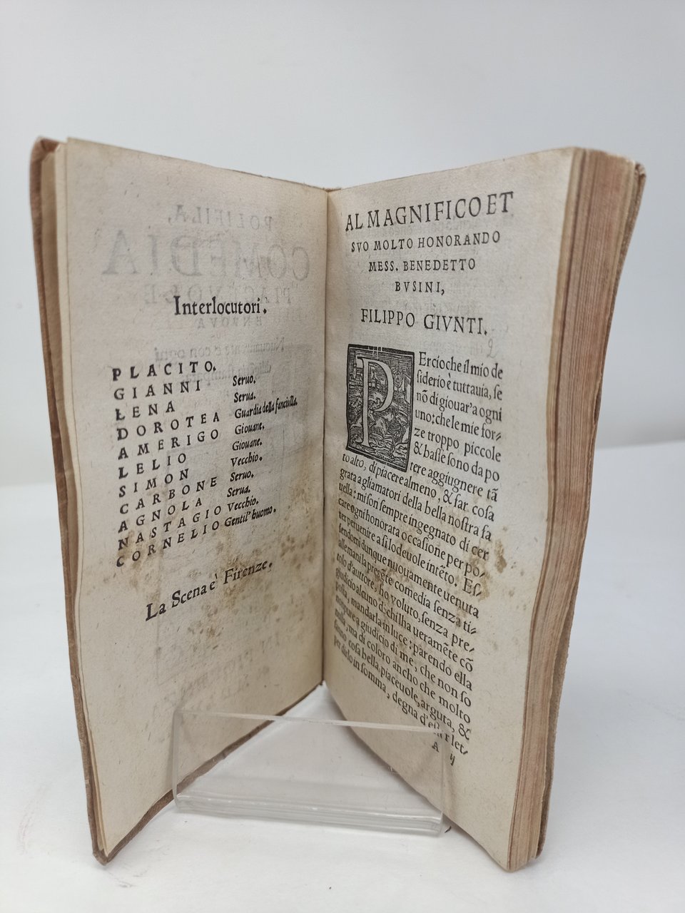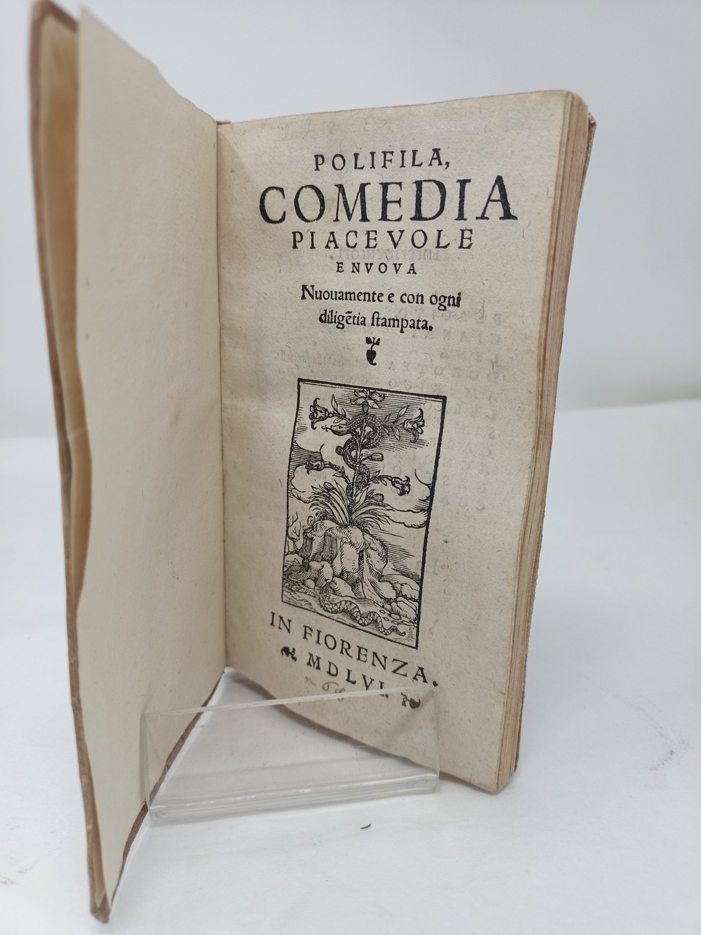 >in-8, ff. 48 n.n. (l'ultimo bianco), leg. moderna in p. perg. Grande impresa tipogr. al titolo e in fine, due grandi iniziali istoriate. Prima edizione di rarissima commedia, ritrovata manoscritta anonima, secondo la lettera di Benedetto Busini a Filippo Giunti, che precede il testo. È ritenuta opera dello stesso Busini, o, più propriamente attribuita al Gelli. Ambientata a Firenze, consta di un prologo e di cinque atti. Ricalca lo schema della schermaglia amorosa, con implicazioni assai licenziose; curioso il fatto che la bellissima Polifila, figlia di uno dei protagonisti, cui è intitolata la commedia, non figuri tra i suoi personaggi. Bell'esemplare (qualche piccola macchia, angolo inf. dell'ultimo f. bianco restaurato). Melzi, Diz. opere anonime II, p.356. Soleinne IV, 4238: ''Elle est rare. On y trouve toute la licence de l'Arétin et de Machiavel''. Clubb 18Allacci 636. Non in Rasi. Camerini 162 (erra la paginazione). Gay, Bibl. de l'Amour III, 807-8: ''Pièce très licensieuse''.