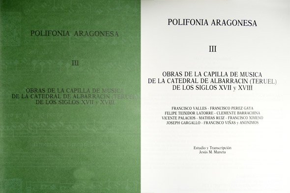 Polifonía Aragonesa III. Obras de la Capilla de Música de la Catedral de Albarracín (Teruel) de los Siglos XVII y XVIII. [Francisco Vallés, Francisco Perz Gaya, Felipe Teixidor Latorre, Clemente Barrachina, Vicente Palacios, Matias Ruiz, Francisco Ximeno, Joseph Gargallo, Francisco Viñas y anónimos]. Estudio y transcripción de Jesús María Muneta Martínez.