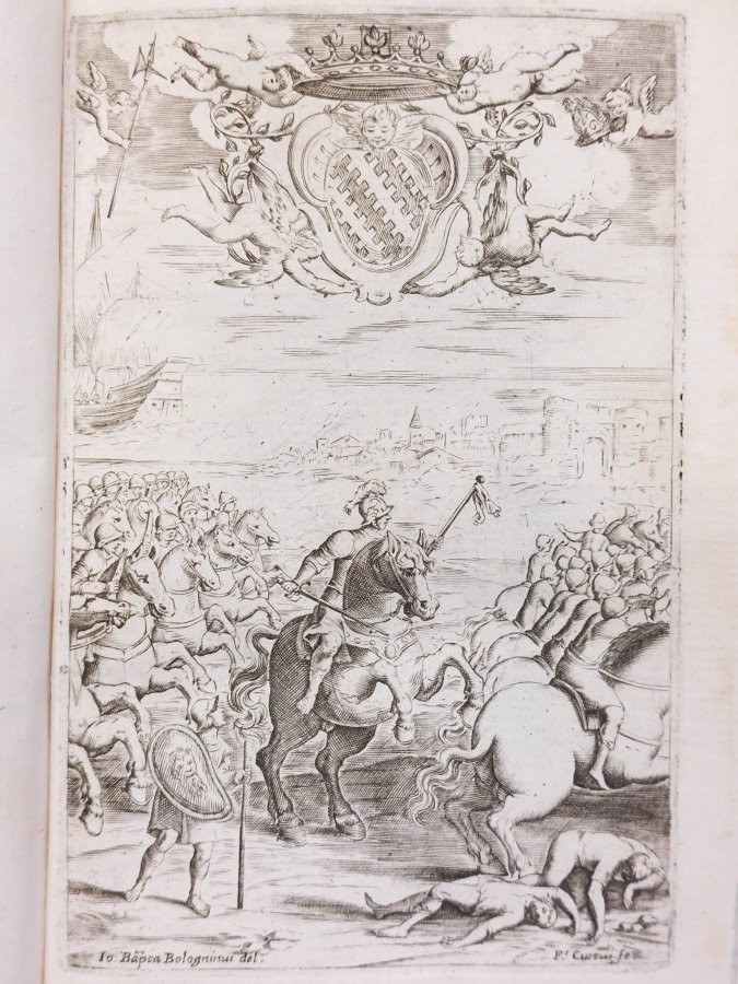 <span style="font-style: normal;">In-8° (cm. 18,5), legatura coeva in piena pergamena, tagli spruzzati; pp. 89 [1] con 1 antiporta incisa in rame da Francesco Curti su disegno di Giovanni Battista Bolognini, e 5 tavole illustrative sempre in rame fuori testo degli stessi; al frontespizio marca usata dai Giolito nel XVI secolo; stemma araldico al verso dell'ultima carta; firma di appartenenza del XVIII secolo al risguardo del conte Emilio d'Emilj. Rara edizione ideata da Faustino Avogadro di Brescia, presso il cui palazzo </span>di via Moretto in S. Alessandro <span style="font-style: normal;">aveva eretto una stamperia con l'obiettivo di proporre giolitine, anche con falsa data. Cfr. V. Peroni, </span><i>Biblioteca bresciana</i>, II, 1818-1823, p. 222. Ottimo esemplare. (SD4)