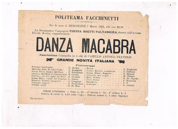 Politeama Facchinetti. Mercoledì 7 marzo 1894 presentazione della commedia in 4 atti Danza macabra di Camillo Antona Traversi dalla compagnia Teresa Boetti-Valvassura e diretta da Florido Bertini.