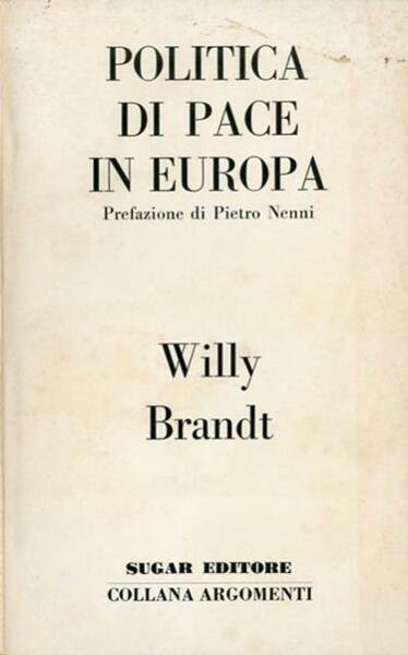 IV, 252 p. ; 21 x 14 cm. Argomenti, 37. Questo può essere considerato il testo principale nel quale Willy Brandt, Cancelliere della Repubblica Federale di Germania dal 21 ottobre 1969 al 6 maggio 1974, espose la filosofia della sua «Ostpolitik». Membro del Partito socialdemocratico di Germania (SPD), di cui fu Presidente dal 1964 al 1987, Brandt è stato anche sindaco di Berlino Ovest dal 1957 al 1966, Ministro degli esteri e Vicecancelliere dal 1966 al 1969, Presidente dell'Internazionale socialista dal 1976 al 1992. La sua innovativa politica estera fu nota appunto come «Ostpolitik», una politica basata sulla necessità della normalizzazione dei rapporti con la Repubblica Democratica Tedesca e con gli altri paesi del blocco orientale. Per questa sua attività nella politica di distensione tra i due blocchi contrapposti gli venne conferito il premio Nobel per la pace il 10 dicembre 1971. Prefazione di Pietro Nenni. Titolo originale dell'opera. «Friedenspolitik in Europa». Traduzione di Clara Cavallazzi. Brossura editoriale, coperta in cartoncino flessibile, titolo impresso in nero al piatto e al dorso. Qualche leggero segno del tempo alla coperta, per il resto libro integro. Codice libreria 8121.