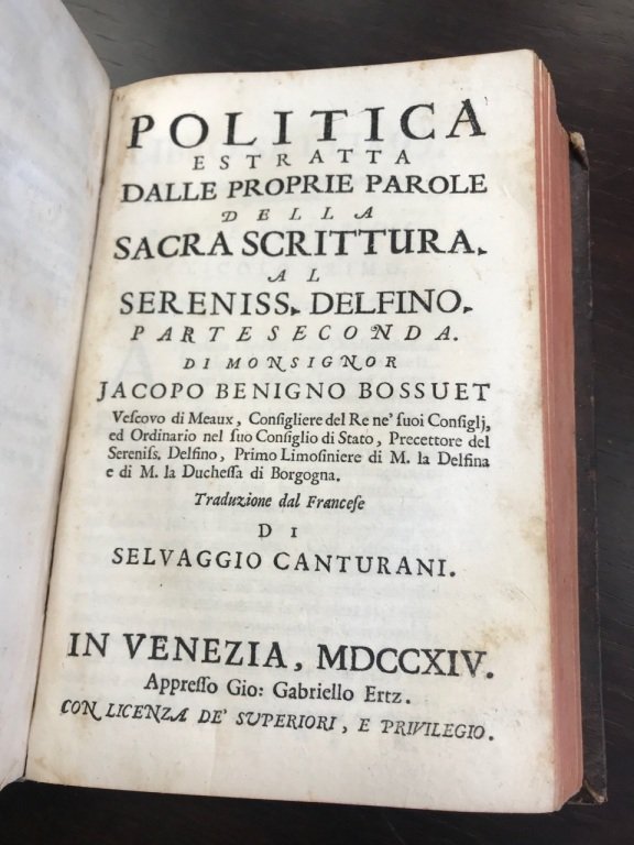 <span style="font-style: normal;">3 volumi in 1 in-8° (cm. 16,5), legatura coeva in piena pelle con titolo su tassello e fregi in oro al dorso (usure e piccole mancanze alle cerniere), tagli rossi, risguardi marmorizzati; pp. [48] 264 [16], 341 [21], 79 [1] in buono stato, con fioriture sparse; antica firma di appartenenza (1820) ed </span><i>Ex libris</i><span style="font-style: normal;"> al primo frontespizio. I primi due volumi sono la p</span>rima edizione della traduzione italiana del saggio politico di Bossuet, condotta da Selvaggio Canturani (pseudonimo di Arcangelo Agostini); il terzo di molto successivo è la prima edizione della traduzione italiana del saggio sugli spettacoli teatrali dello stesso autore, <i>Massime e riflessioni sopra la comedia tradotte in lingua toscana da un sacerdote lucchese</i>, Venezia, Hertz, 1730. Esemplare più che discreto. (SG5)