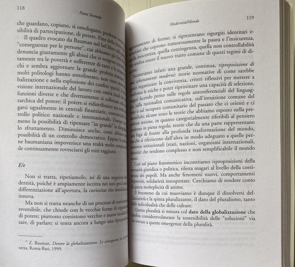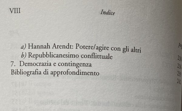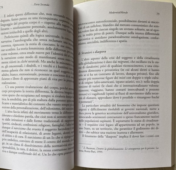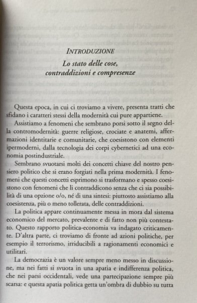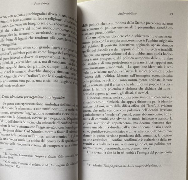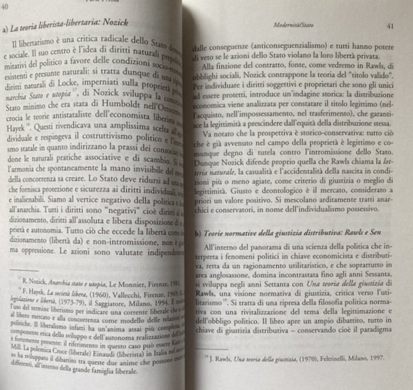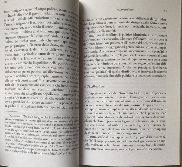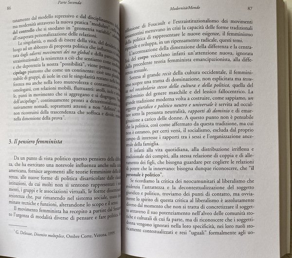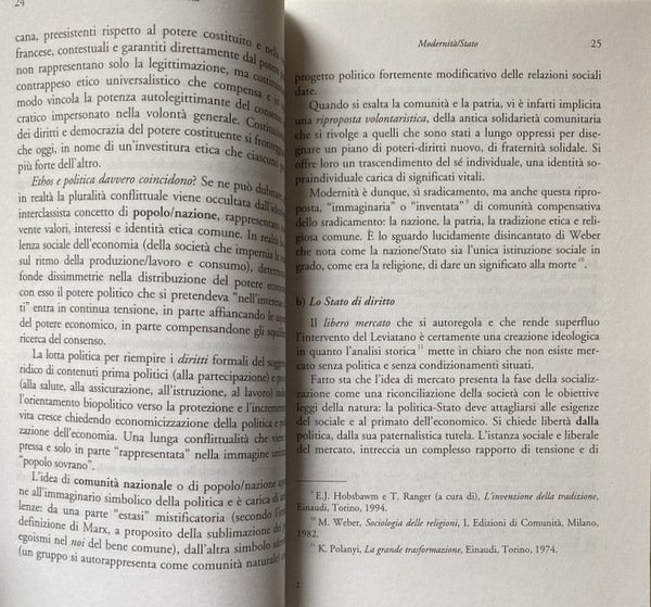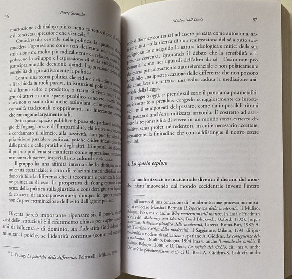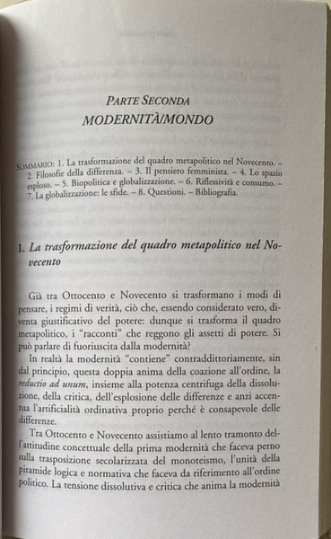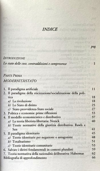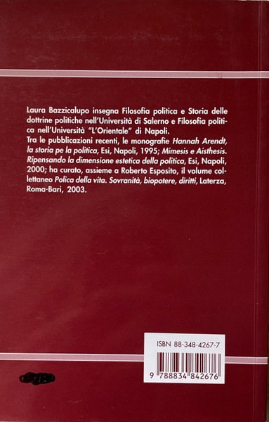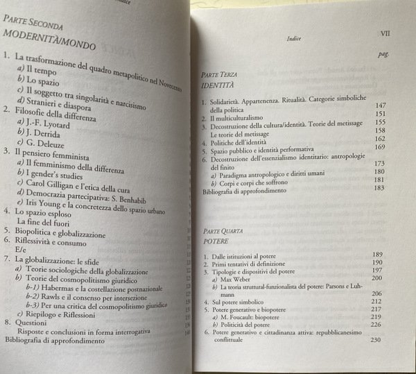 Soggetti: Politica, Storia, Potere, Modernità Società moderna, Comunicazione, Tecniche di governo, Governance, Globalizzazione, Lessico politico, Ideologie, Teorie politiche, Scienza e teoria, Istituzioni, Organizzazioni, Aspetti socio-culturali, Hannah Arendt, Hermann Broch, Biopolitica, Economia, Paradigmi, Categorie, Teologia, Carl Schmitt, Michel Foucault, Filosofia, Critica, Totalitarismo, Rappresentanza, Interessi, Interpretazione, Lavoro, Legge, Libertà, Pensiero, Progresso, Etica, Eticizzazione, Socializzazione, Rivoluzione, Stato di diritto, Stato sociale, Provvidenza, Libertarismo, Nozick, Liberismo, Liberalismo, Identità, Paradigma identitario, Emigrazione, Teorie identitarie, Comunitarismo, Comunità, Appartenenza, Cittadinanza, Diritti civili, Habermas, Pluralismo, Diritti umani, Principi fondamentali, Costituzione, Tempo, Spazio, Metapolitica, Novecento, Riflessività, Consumo, Consumismo, Narcisismo, Stranieri, Diaspora, Esodo, Esilio, Lyotard, Derrida, Deleuze, Felix Guattari, Martin Heidegger, Schizofrenia, Studi di genere, Femminismo, Carol Gilligan, Cura, Partecipazione, Democrazia, Seyla Benhabib, Iris Young, Sociologia, Cosmopolitismo, Postnazionalismo, Postmodernismo, Rawls, Ritualità, Solidarietà, Assistenzialismo, Metissage, Inclusione, Cultura, Tradizione, Riti, Multiculturalismo, Essenzialismo, Antropologia, Sofferenza, Spazio pubblico, Max Weber, Talcott Parsons, Luhmann, Simbolismo, Politicità, Controllo, Sorvegliare e punite, Panopticum, Conflitti sociali, Dominio, Herrshaft, Repubblicanesimo, Parlamentarismo, Crisi, Agire, Azione, Saggistica, Studi culturali, Democrazia, Contingenza, Biopotere, Cibernetica, Religione, Secolarizzazione, Teocrazia, Guerre, Occidente, Imperialismo, Geopolitica, Lobby, Contaminazione, Bartleby, Melville, Esclusione, Discriminazioni, Razzismo, Legittimità, Privato, Organismi sovranazionali, Sovranità, Territorio, Limiti, Confini, Norme, Burocrazia, Bibliografia Riferimento, Consultazione, Libri Vintage Fuori catalogo, Machiavelli, Bodin, Hobbes, Simone Weil, Giorgio Agamben, Pierre Bourdieu, Elias Canetti, C. Castoriadis, Harold Lasswell, Max Weber, T. Todorov, Michel Wieviorka, Shoah, Jean-Luke Nancy, Semprini, R. Sennett, Touraine, M. Augé, F. Crespi, U. Ulf Hannerz, Hegel, Roberto Esposito, Giddens, Will Kymlicka, Christopher Lasch, Z. Bauman, Norberto Bobbio, Bentham, Dworkin, Horkheimer, Marramao, Maffettone, Salvatore Veca, F. Neumann, Karl Polanyi, Rousseau, Sandel, Zagrebelsky, Amartya Sen, Eric Hobsbawm, Kant, M. Walzer, A. Del Lago, Durkheim, No-Global, Movimenti politici, Militanza, Anarchia, Utopia, Giustizia distributiva, Solidarietà, Meritocrazia, Economicismo, Diseguaglianza, Ricchezza, Redistribuzione, Antagonismo, Manuali, Politics, History, Power, Modernity Modern society, Communication, Government techniques, Globalization, Political lexicon, Ideologies, Political theories, Science theory, Institutions, Organizations, Socio-cultural aspects, Biopolitics, Economy, Paradigms, Categories, Theology, Philosophy, Criticism, Totalitarianism, Representation, Interests, Interpretation, Work, Law, Freedom, Thought, Progress, Ethics, Ethicization, Socialization, Revolution, Rule of law, Welfare state, Providence, Libertarianism, Liberalism, Liberalism, Identity, Identity paradigm, Emigration, Theories of identity, Communitarianism, Community, Membership, Citizenship, Civil rights, Pluralism, Human rights, Fundamental principles, Constitution, Time, Space, Metapolitics, Twentieth century, Thoughtfulness, Consumption, Consumerism, Narcissism, Foreigners, Exodus, Exile, Schizophrenia, Gender studies, Feminism, Care, Participation, Democracy, Sociology, Cosmopolitanism, Postnationalism, Post Modernism, Rituality, Solidarity, Welfarism, Inclusion, Culture, Tradition, Rites, Multiculturalism, Essentialism, Anthropology, Suffering, Public space, Symbolism, Politics, Control, Watch and punish, Panopticum, Social conflicts, Domination, Republicanism, Parliamentarianism, Crisis, Action, Action, Nonfiction, Cultural Studies, Democracy, Contingency, Biopower, Cybernetics, Religion, Secularization, Theocracy, Wars, West, Imperialism, Geopolitics, Lobbying, Contamination, Exclusion, Discrimination, Racism, Legitimacy, Private, Supranational Organizations, Sovereignty, Territory, Limits, Borders, Norms, Bureaucracy, Reference Bibliography, Consultation, Out of print Books, Political Movements, Militancy, Anarchy, Distributive Justice, Solidarity, Meritocracy, Economicism, Inequality, Wealth, Redistribution, Antagonism, Manuals