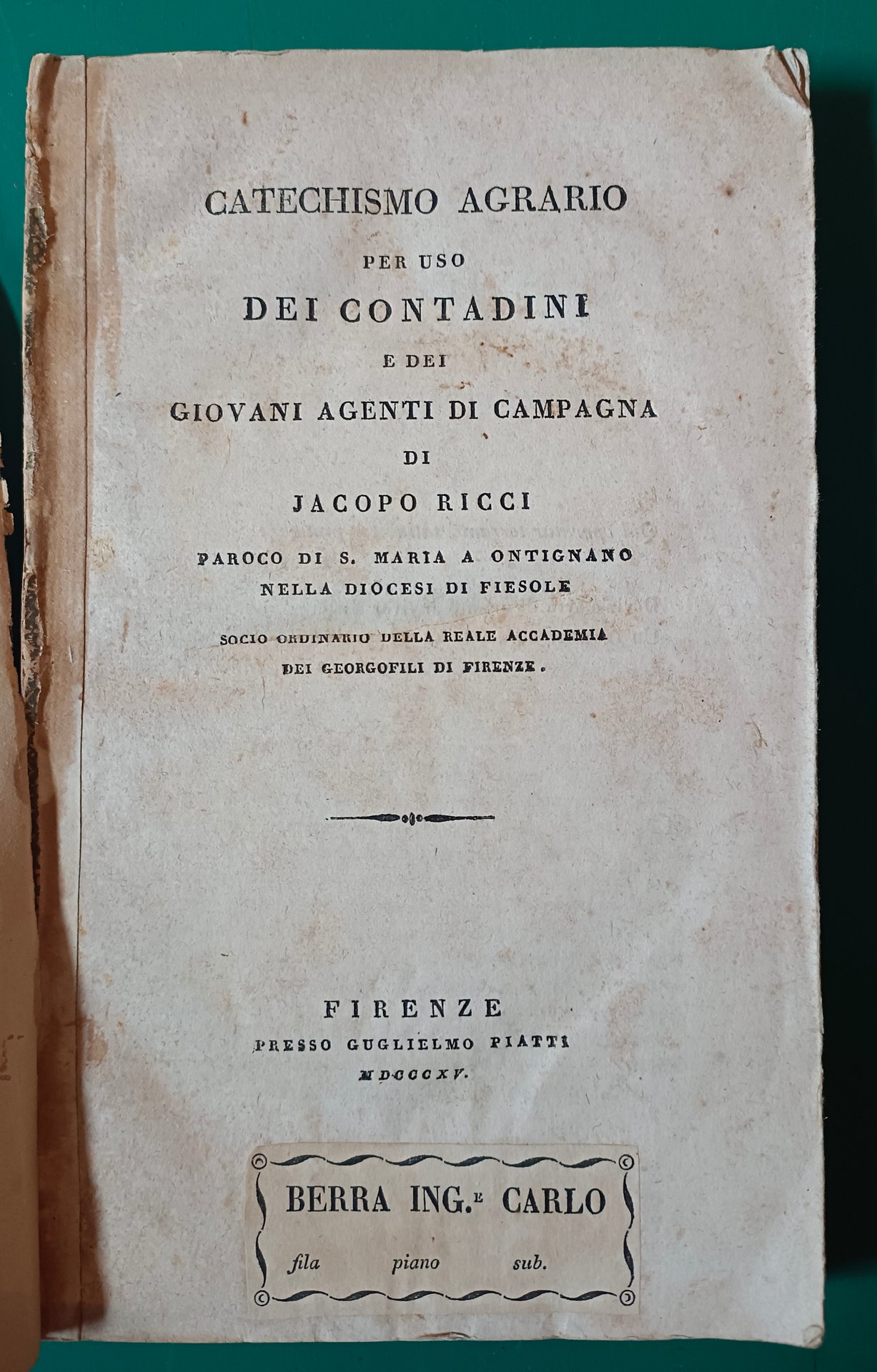 Pollini Ciro - CATECHISMO AGRARIO coronato dell'accademia d'agricoltura, commercio ed arti di Verona. Verona, Società tipografica, 1819. Cm 21,5. Brossura muta moderna. Titolo manoscritto al dorso. Pagine (1), x, 464, 4 con indice delle altre opere pubblicate dall'autore. Prima edizione.