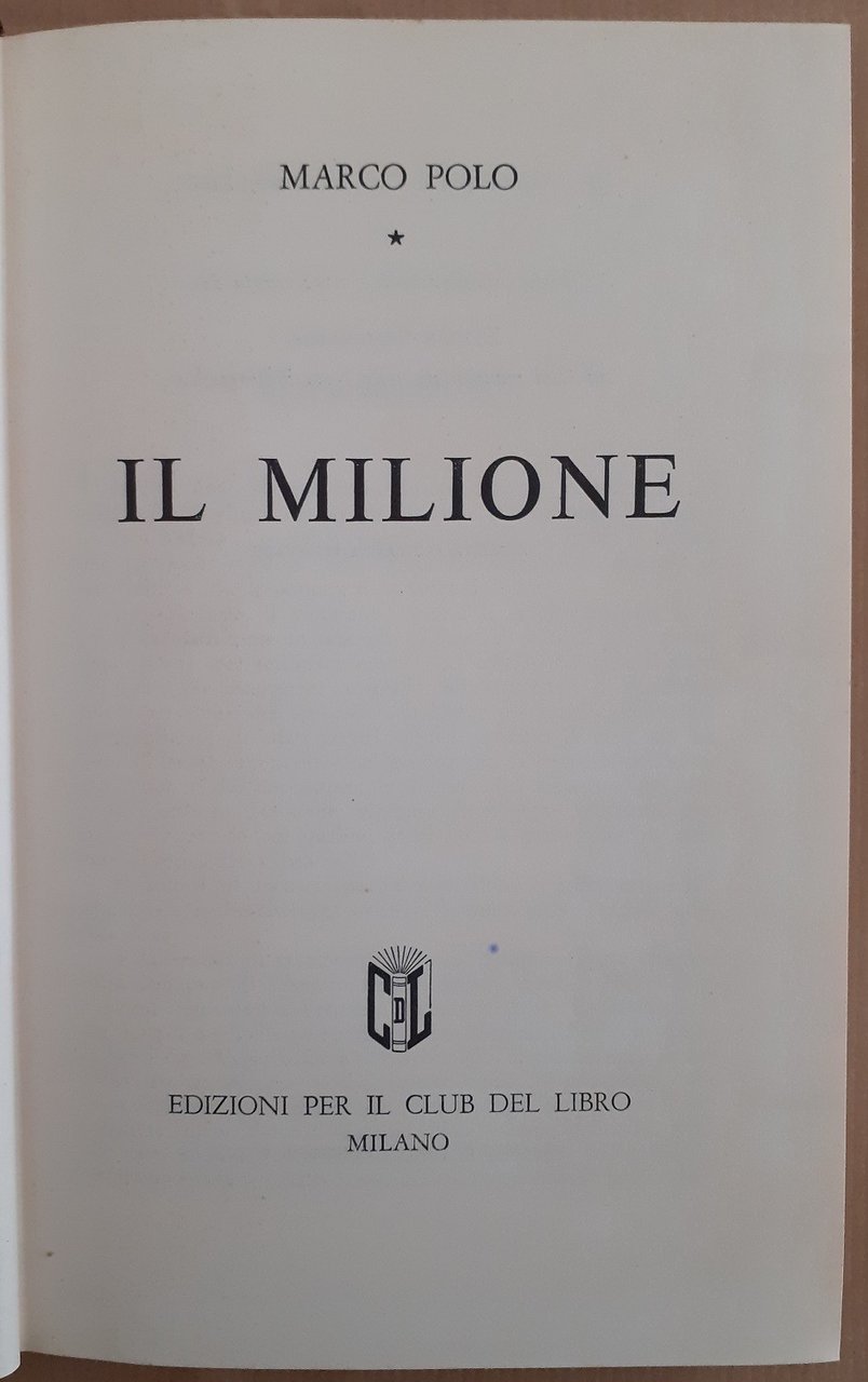 Marco Polo, Il milione, a cura di Ettore Camesasca, Edizioni per il Club del Libro, Milano 1965, pp. 446, cm 22, legatura in mezza similpelle ed. con titoli e fregi al dorso e piatti in carta marmorizzata. Collana dei saggisti memorialisti e viaggiatori, vol. 11. Esemplare n. A0136. Lievi tracce d’uso alla legatura, minime fioriture ai tagli, per il resto ottimo esemplare.