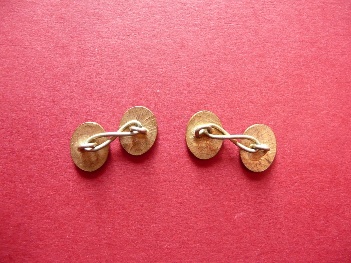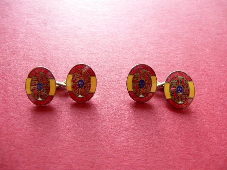 Polsini smaltati, Polsini militari smaltati Falange Spagnola Originali Polsini originali d'epoca (anni '30 circa), smaltati ai colori della bandiera di Spagna; forma ovale. Con fregi in rilievo.Cm 1x0,5. Condizioni di conservazione Esemplare ben conservato con tracce d'uso, pressoché trascurabili segni del tempo. SC04.D0171 N
