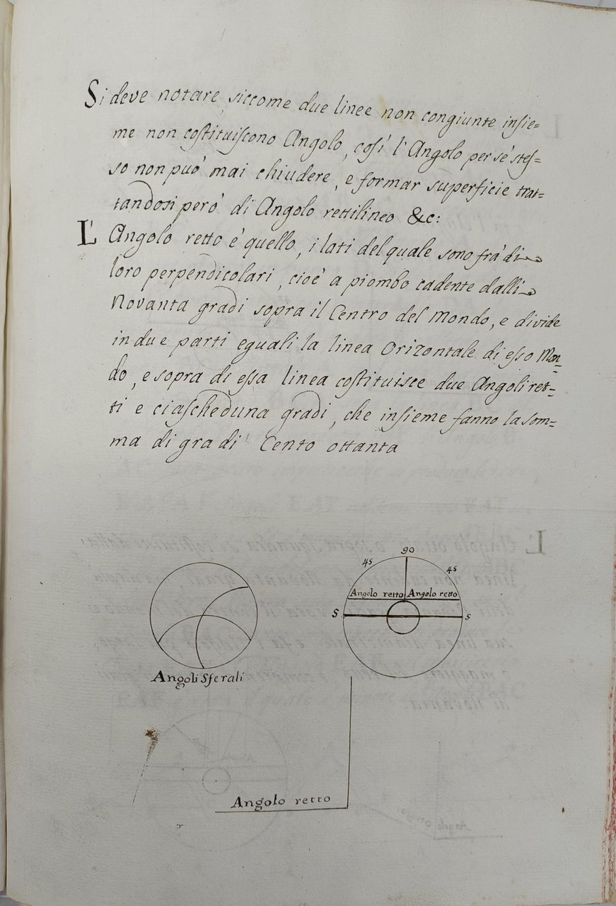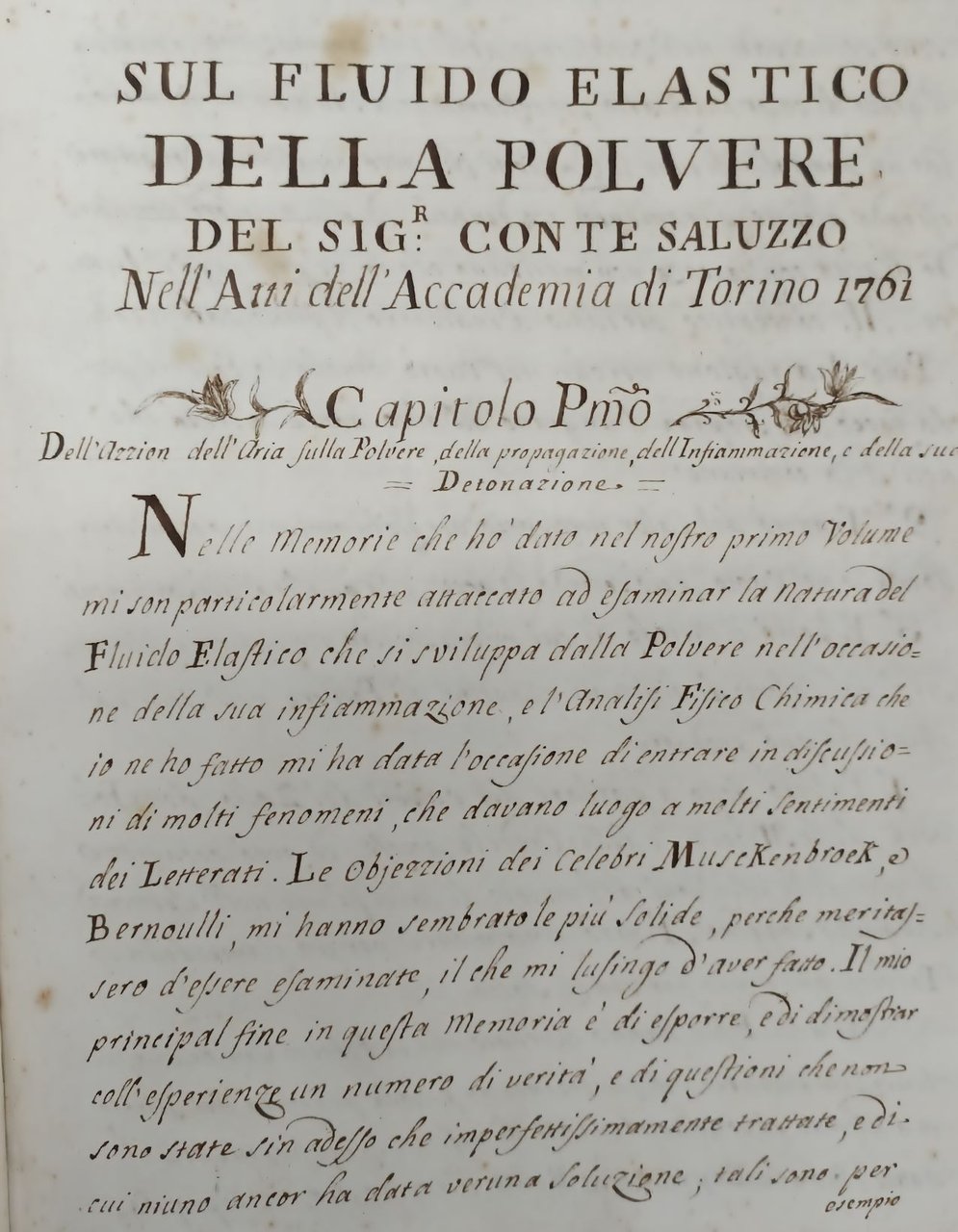>in-4 (mm 110x80), anonimo manoscritto su carta ( filigrana con colomba su monte) entro tondo con lettera “L”, legatura in graziosa carta decorata con mirtilli. Testo chiaramente vergato in corsivo da un'unica mano. Comprende tre opere, di cui solo una sicuramente edita, di argomento tecnico-scientifico indispensabile in ambito militare. Comprende: I ) Conte di Saluzzo “Riflessioni sul fluido elastico della polvere… Nell'Atti dell'Accademia di Torino 1761”; ff. 18 (paginati in alto a destra 446-481). Piccoli fregetti floreali a penna ornano l'inizio dei vari capitoli. Interessante scritto edito sugli Atti dell'Accademia delle scienze in cui l'autore riporta alcune esperienze di miscele per ottenere una migliore polvere da sparo. II ) Trattato De Principi di Geometria Per uso del Sergente Giovanni Ascenzj (ff. 15, 1 bianco) privi di numerazione; con numerose figure nel testo. Breve sunto di geometria realizzato da tale Giovanni Ascenzi, di cui allo stato attuale delle ricerche non si è trovata nessuna corrispondenza. III) Delineazione De Mantici di legno ff. 10 (paginati 482-500). Anonimo e apparentemente inedito trattatello per la costruzione e il funzionamento dei mantici. Il manoscritto venne probabilmente composto e assemblato da un dotto militare del XVIII secolo per arricchire le sue conoscenze teoriche.