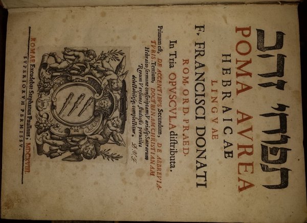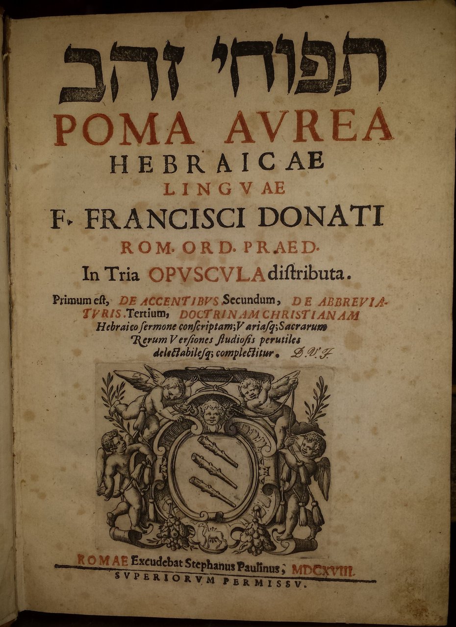 Poma aurea Hebraicae linguae F. Francisci Donati Rom. Ord. praed. in tria opuscula distributa. Primum est, de accentibus. Secundum, de abbreuiaturis. Tertium, doctrinam christianam Hebraico sermone conscriptam; variasque sacrarum rerum versiones studiosis perutiles delectabilesque complectitur