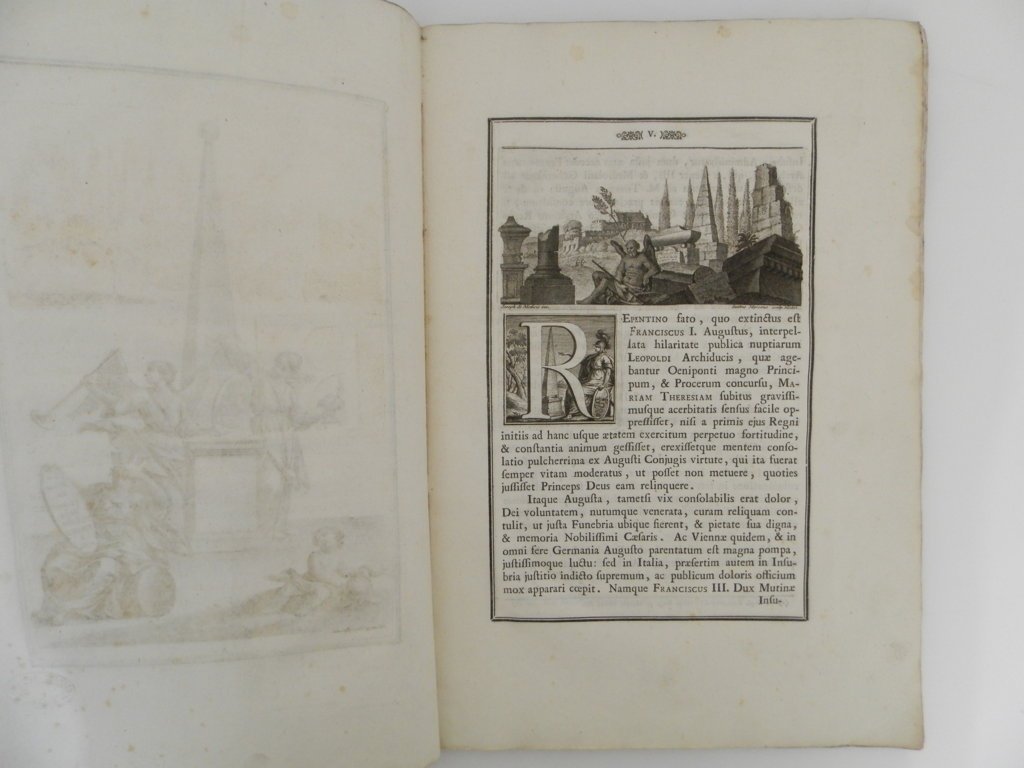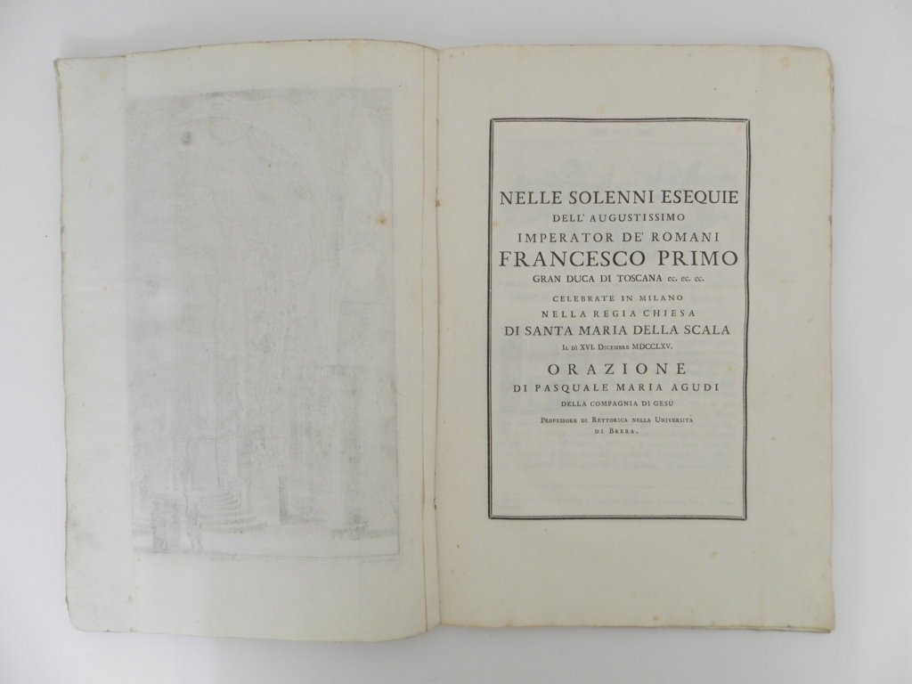 In folio, mm 370x255, pp. LVI, due parti in numerazione continua. Legatura in cartoncino coevo con rinforzo in pergamenaceo al dorso, titolo manoscritto su tassello. Buono stato della legatura, minimi segni del tempo; copia genuina, a grandi margini e di nitida impressione, con lievissime bruniture alle carte A1-A2, ossia la prima bianca (con minuscolo foro all'angolo inferiore) e il frontespizio, recante timbro all'angolo del margine bianco “Catroni Agostino Milano”. Ex libris applicato al contro-piatto.Frontespizio figurato in calcografia, testo composto di iscrizioni funerarie in latino entro cornice nera, 3 tavole di medaglie incise a piena pagina, un bel finalino calcografico e una tavola incisa ripiegata raffigurante l'interno di Santa Maria della Scala. Seconda parte con autonomo frontespizio “Nelle solenni esequie dell'augustissimo Imperator de' Romani Francesco primo (…) Orazione di Pasquale Maria Agudi.”; testo in italiano entro cornice nera, grande testatina all'acquaforte e grande capolettera allegorico, dati tipografici all'ultima carta G4, numerata LVI. Segnatura A-G. L'apparato iconografico è da attribuire a Giovanni Battista Manzoni; Francesco Croce; Carlo Riccardi; Giacomo Mercol. Edizione originale delle esequie e del discorso funebre tenuto da Pasquale Maria Agudi per la morte del primo imperatore asburgico del sacro romano impero: di assoluta rarità. 4 esemplari nelle biblioteche italiane, (Braidense, Bertarelli, Trento Comunale, Trento Cappuccini) e 3 all'estero: Yale, University of Illinois e Getty Institute, quest'ultima con ex-libris Sormani Andreani Verri). La nostra copia, collazionato e conforme alle altre, si presenta nella variante B distinguibile per la cornice tipografica e il frontespizio stampati in nero e non in rosso. Cicognara (I, 1522). . *** TUTTI I NOSTRI LIBRI SONO VISIBILI PREVIO CONTATTO MAIL O TELEFONO NELLA NUOVA SEDE DI MILANO: LIBRERIA COSMOPOLIS, VIA JOMMELLI, 22. ***