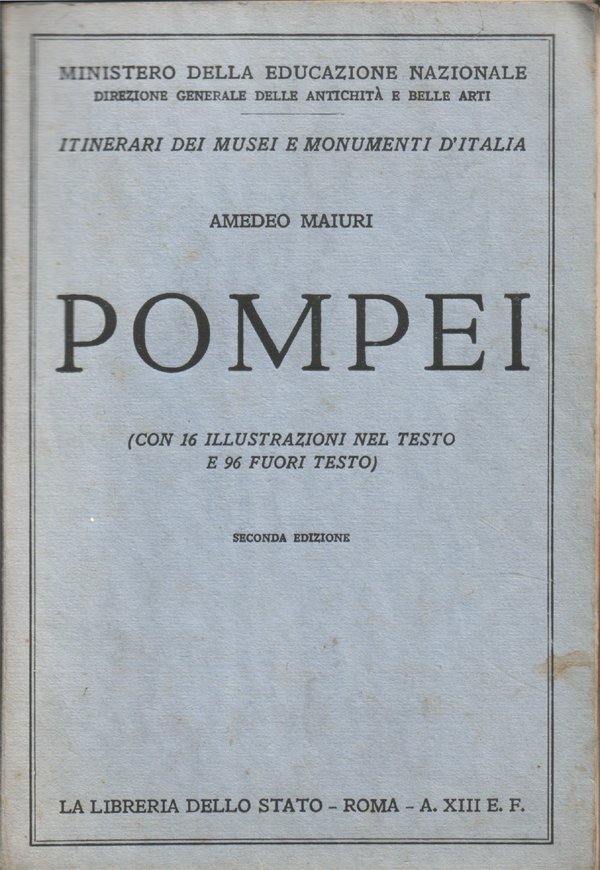 In-16°, pp. (4), 150, (2), copertina editoriale. Con sedici figure in bianco e nero nel testo e cinquantatre tavole, anch'esse comprese nella numerazione delle pagine, con novantasei illustrazioni fotografiche in bianco e nero. Da pagina 85 alla fine, nella parte superiore delle pagine, l'esposizione ad umidità ha provocato una leggera ondulazione della carta (senza aloni o macchie). Sommario: Avvertenza; Avvertenza alla seconda edizione; Notizie itinerarie; Cenno storico; Lo scavo; Sguardo generale; Materiali ed epoche di costruzione; La decorazione; Tipi della decorazione parietaria; La decorazione musiva; La casa; Popolazione; Iscrizioni e graffiti; Il Foro, i templi ed i monumenti pubblici; Il Foro trangolare e il Tempio greco; I teatri; L'anfiteatro; Le terme; Case e quartieri; Quartieri di nord; Quartieri del centro; Quartieri di sud; Regione I ed i nuovi scavi; I nuovi scavi; La Via dei Sepolcri. Appendice. Antiquarium.