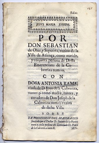 Por Don Sebastian de Olier y Sopuerta, vezino de la Villa de Atiença, como marido y conjunta persona de Doña Emerenciana de la Cabreriza, con Doña Antonia Rama, viuda de Don Joan de la Cabreriza, como madre, tutora y curadora de Don Joseph de la Cabreriza, vezina de dicha Villa, sobre la Possession del Mayorazgo fundado por el Doctor Don Jacinto de la Fuente, en la persona del Licenciado Don Pedro de la Cabreriza.
