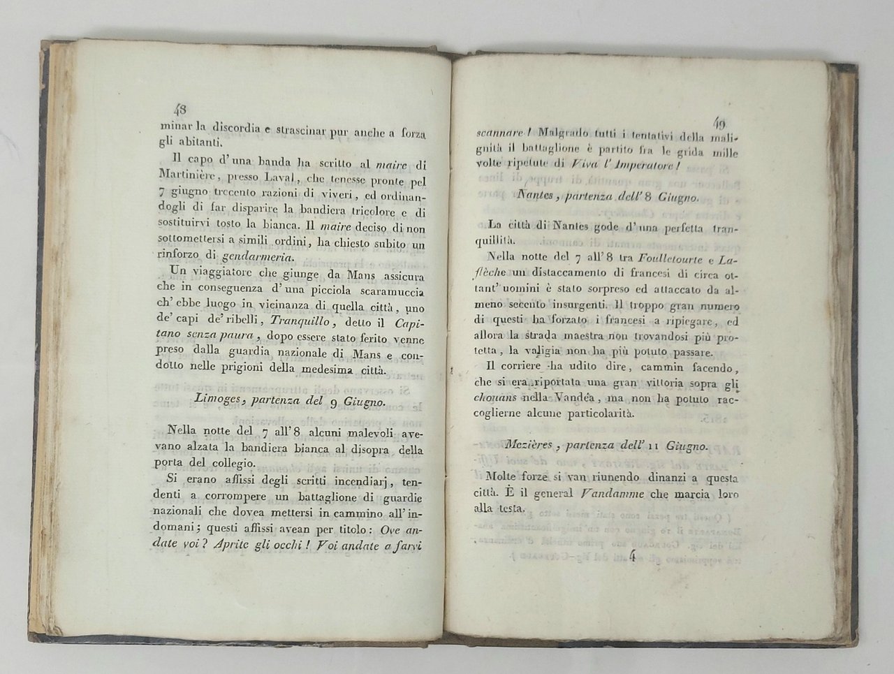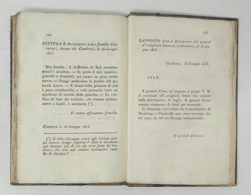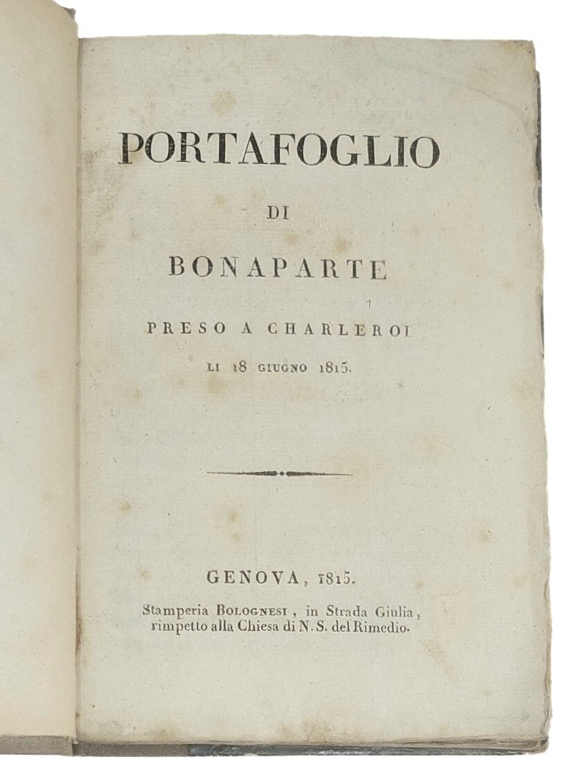 >in-8, pp. 123, (1), una tavola f.t. con facsimile di minuta autografa di Napoleone. Legatura in m. tela, piatti in carta decorata, titolo in oro al dorso. Rara edizione genovese, apparentemente sconosciuta. Raccolta di lettere, rapporti, dispacci che nella prefazione si dice contenuti in un Portafoglio del Barone Fain, primo segretario di gabinetto di Bonaparte, spedito a Bruxelles da un prigioniero al servizio dei Paesi Bassi di nome Van Uchen: "..tutte le carte in esso contenute, sono di una data assai fresca; e siccome danno un gran lume per conoscere lo stato interno della Francia, noi siam sollecitati a pubblicarle". Ottimo esemplare, al contropiatto anteriore ex libris di Ambroise de Casabianca.